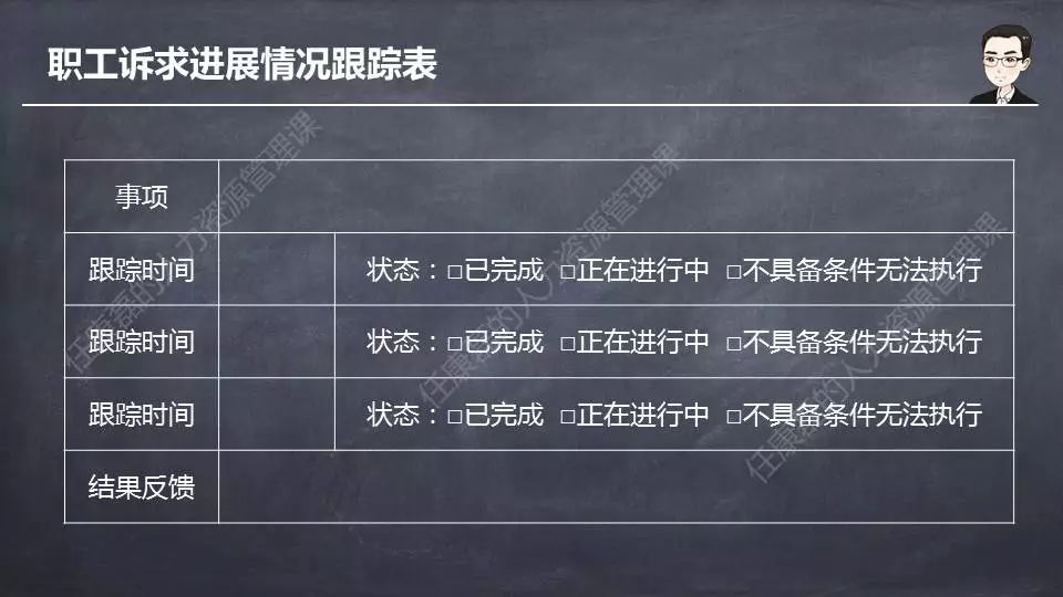 人力资源部对职工诉求事项的处理情况要及时督促办理,并定期跟踪评估进展情况,职工诉求跟踪评估表。