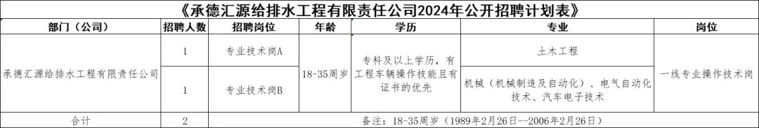附件:《承德汇源给排水工程有限责任公司2024年公开招聘计划表》