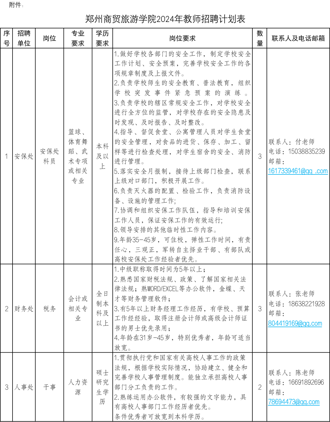 3.具体学历要求参照《郑州商贸旅游职业学院2024年教师招聘计划表》。