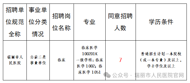 (备注:瑞丽市人民医院拟招聘的具体岗位为:心内科1人、神经内科2人、儿科1人,骨外科1人,耳鼻咽喉科1人、重症医学科1人。)