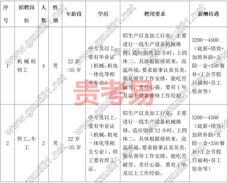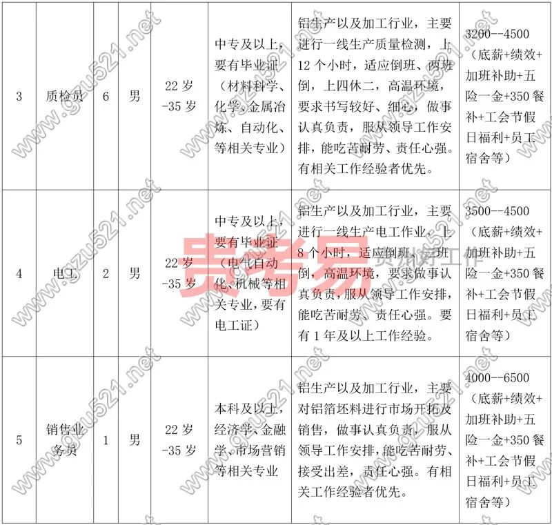 贵州中铝铝业有限公司于成立2011年1月,是为了落实省委、省政府,市委、市政府推进铝及铝加工产业链,实现贵州由铝资源大省向铝及铝加工强省转变而组建的。贵州中铝铝业有限公司由贵州贵铝新材料股份有限公司、贵州铝厂有限责任公司和贵阳白云工业发展投资有限公司共同组建。公司总投资8.68亿元,现有员工约500人,占地面积约400亩,设计年产15万吨铝板带,6万吨铝箔产品。2011年7月公司正式进入土建项目,2012年9月进入设备安装调试阶段。2014年7月全部建成投产。主要生产经营铝合金板、带、箔及新品技术开发等。公司主要设备和技术工艺居国内同行业先进水平,具有年产15万吨铝板带生产能力,可生产加工多种高附加值铝箔坯料产品。 二、面试以及工作地址:贵阳市白云区云环东路595号 贵州中铝铝业有限公司 微信联系,招满为止。雷女士微信:18885209188、18209827005(请求加好友请备注应聘岗位+年龄+学历和专业+应聘优势)。