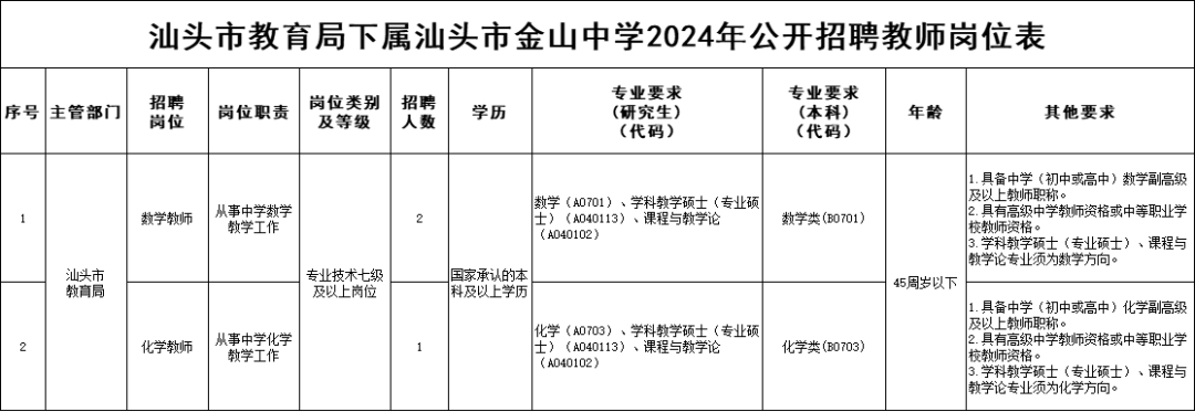 招聘对象详见《汕头市教育局下属汕头市金山中学2024年公开招聘教师岗位表》(附件1)。