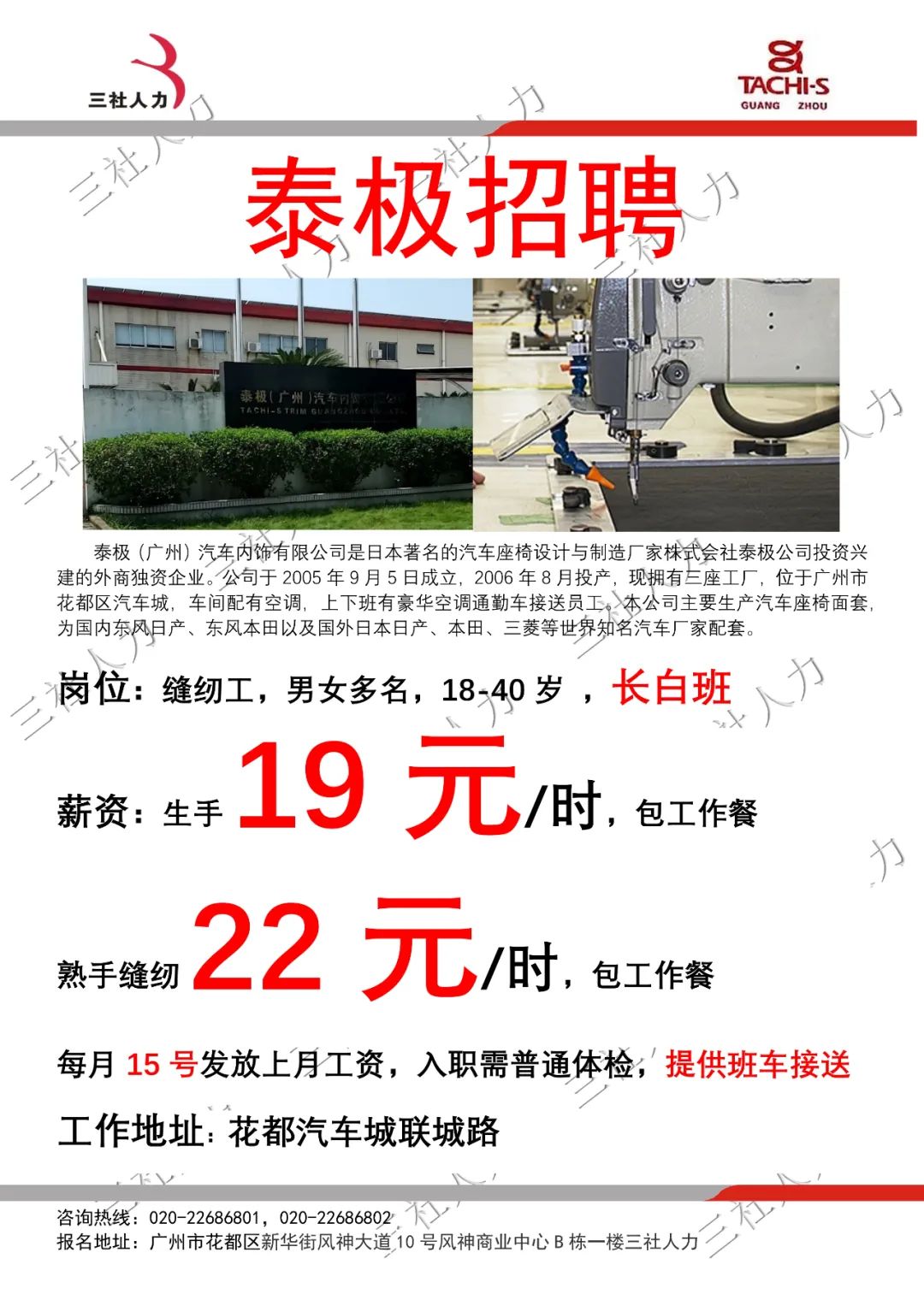 >【泰极招聘】招聘生熟手缝纫工,长白班,提供班车接送