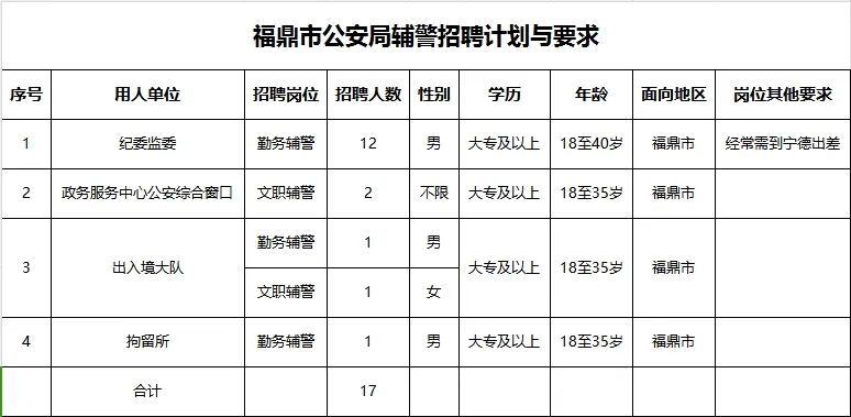 辅警17名(其中:男性14名,女性1名,不限2名),具体招聘岗位与要求详见附件。