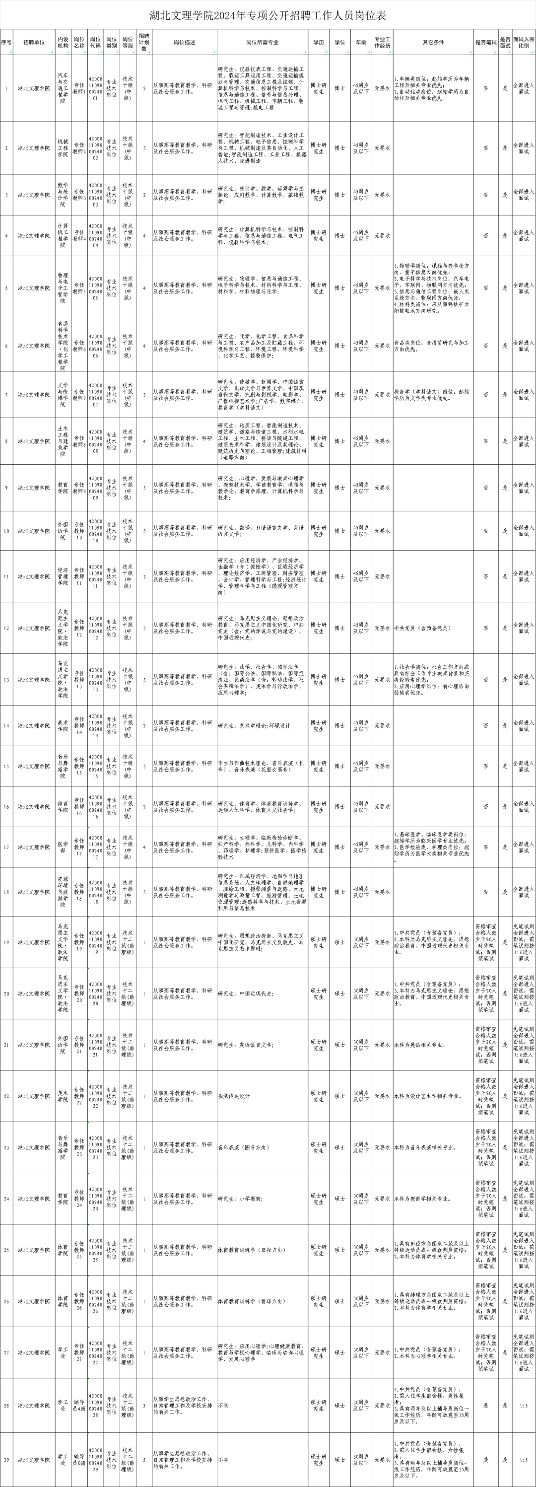 湖北文理学院2024年专项公开招聘工作人员公告 为贯彻党的二十大精神,更好实施“才聚荆楚”工程,促进高校毕业生留鄂来鄂就业创业,建设高素质专业化干部人才队伍,根据《事业单位公开招聘人员暂行规定》(人事部令第6号)等文件精神,我单位拟面向社会专项公开招聘77名工作人员。现将有关事宜公告如下。 一、单位简介 湖北文理学院是省属全日制普通本科高等院校,位于全国历史文化名城、湖北省省域副中心城市—襄阳市,是硕士学位授予单位、教育部本科教学工作水平评估优秀学校、全国普通高等学校毕业生就业工作先进集体、全国民族团结进步模范集体。 二、招聘原则 坚持党管干部、党管人才,坚持德才兼备、以德为先、任人唯贤,坚持因岗择人、人岗相适,坚持公开、平等、竞争、择优。 三、招聘条件 (一)基本条件 1.具有中华人民共和国国籍; 2.拥护中华人民共和国宪法,拥护中国共产党领导和社会主义制度,遵纪守法; 3.具有良好的政治素质和道德品行; 4.具有岗位所需的专业知识、业务能力或技能条件; 5.具有正常履行职责的身体条件和心理素质; 6.具备岗位所需的其他条件。 (二)具体条件 详见《湖北文理学院2024年面向社会专项公开招聘工作人员岗位表》(附件1,以下简称《岗位表》)。 (三)以下人员不能应聘 1.现役军人; 2.全日制高校在读的非应届毕业生; 3.涉嫌违法违纪正在接受审查的人员和尚未解除党纪、政务等处分的人员; 4.在各级公务员招录和事业单位公开招聘考试中被认定有严重违纪违规行为尚在禁考期内的人员; 5.按照《事业单位公开招聘人员暂行规定》《事业单位人事管理回避规定》等应当执行回避制度的人员; 6.法律法规规定的其他情形。 四、引进博士待遇 1.提供40~150万元安家费。 2.提供5~50万科研启动经费。 3.入校前三年按月享受副教授校内奖励性绩效工资、博士学位津贴、房租补贴等待遇。 4.根据襄阳市引才政策享受生活补贴、住房首付款补贴券、租住人才公寓、协调子女入学等待遇。 5.领军人才、拔尖人才、杰出人才等高层次人才实行“一人一策”办理。 五、报名及资格审查 (一)报名时间和方式 1.报名时间:学历要求为博士研究生岗位报名时间自公告发布之日起至2024年12月31日,招满即止;学历要求为硕士研究生岗位报名时间自公告发布之日起至2024年3月15日。 2.报名方式:学历要求为博士研究生岗位投递应聘邮件至hbwlxyrc@hbuas.edu.cn。 学历要求为硕士研究生岗位请登录湖北文理学院人事处网站页面中 “相关链接”,点击“湖北文理学院人才招聘”(https://rszp.hbuas.edu.cn/rsfw/sys/zpglxt/extranet/index.do#/home)进行在线注册、报名,每人限报1个岗位。 (二)资格审查 1.关于相关时间节点:年龄起算时间为1月1日,如某岗位年龄要求30周岁及以下,即为1994年1月1日及以后出生。具有副高级及以上职称博士研究生年龄可放宽至50周岁及以下。硕士研究生毕业证、学位证取得截止时间为2024年7月31日,国外、境外留学人员须于2024年8月31日前取得教育部中国留学服务中心出具的国(境)外学历(学位)认证证书。博士研究生毕业证、学位证、国(境)外学历(学位)认证证书取得截止时间为2024年12月31日。报名所需各类证件资料(除学历学位外)须于报名截止日前取得。对到期未能按要求取得相应证件的考生,视为自动放弃。高校毕业生在校期间的社会实践、实习等工作经历不作为报考专业工作经历。 2.资格审查所需材料:报考博士研究生岗位的应聘者需提交一份个人近期简历,内容包含:个人基本情况、本硕博学习经历、工作经历、科研成果、个人荣誉或奖励等信息;报考硕士研究生岗位的应聘者须根据人才招聘系统提示提供报名材料扫描件:①本人有效身份证;②各阶段学历学位证书;海(境)外毕业生须提供教育部中国留学服务中心出具的《国外学历学位认证书》;③教育部学历证书电子注册备案表(近期通过学信网打印);④与报考岗位资格相关的证书、证明等。资格复审时提供相关材料原件。如考生提供材料不全(或不符合要求),则视其主动放弃应聘资格。 3.资格审查有关要求:资格审查工作贯穿于公开招聘的全过程。报考人员须对本人填写的信息、提供的证件和有关资料的真实性负责,若有虚假,一经查实,取消其报考或聘用资格。聘用人员上岗后若发现其个人档案材料不实的,学院将解除聘用合同。若报考人员与湖北文理学院教职员工有夫妻关系、直系血亲关系、三代以内旁系血亲关系或近姻亲关系的,须在报名系统中逐一陈述清楚。 4.开考比例:专业技术十级岗位不设置开考比例;专业技术十二级岗位若同一岗位招聘计划与资格审查合格报考人数不足1:3,由学校研究决定取消、核减或保留该岗位。 六、考试考核 (一)笔试 1.专业技术十级岗位:免笔试直接进入面试。 2.专业技术十二级专任教师岗位:若同一岗位资格审查合格报考人数少于20人,则全部进入面试(免笔试);若达到或超过20人,则先笔试,后组织面试。笔试主要考察应聘人员专业技能水平,运用专业知识分析和解决实际问题的能力。 3.辅导员岗位:应聘人员须参加笔试,笔试主要考察应聘人员的政治理论素养,运用习近平新时代中国特色社会主义思想分析和解决实际问题的能力,以及辅导员工作能力等综合素质。 笔试满分为100分,实行笔试最低合格分数线控制,笔试分数达