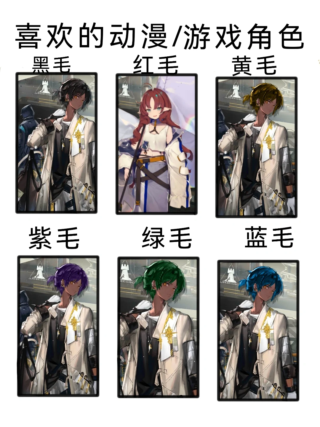 其实我喜欢的角色还挺多的,黑毛红毛黄毛紫毛绿毛蓝毛都有