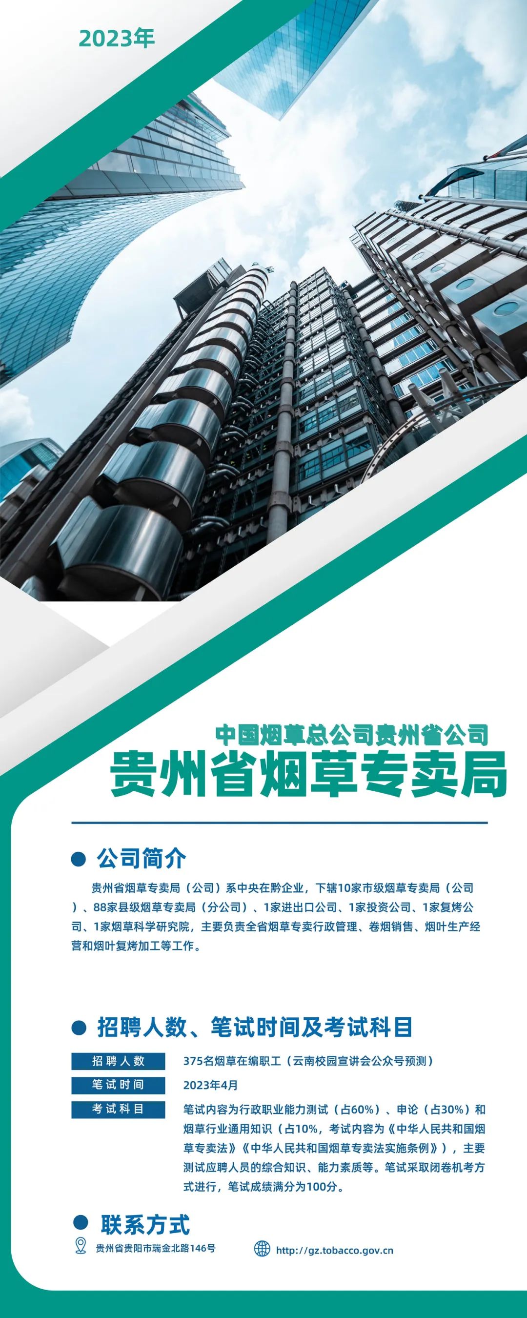 本次共计公开招聘375人,具体招聘单位、专业、岗位、条件,详见附件《2023年贵州省烟草专卖局(公司)公开招聘岗位表》。报考人员可通过以下网站查阅:国家烟草专卖局网站(http://www.tobacco.gov.cn/html/);贵州省烟草专卖局(公司)网站(http://gz.tobacco.gov.cn/)。