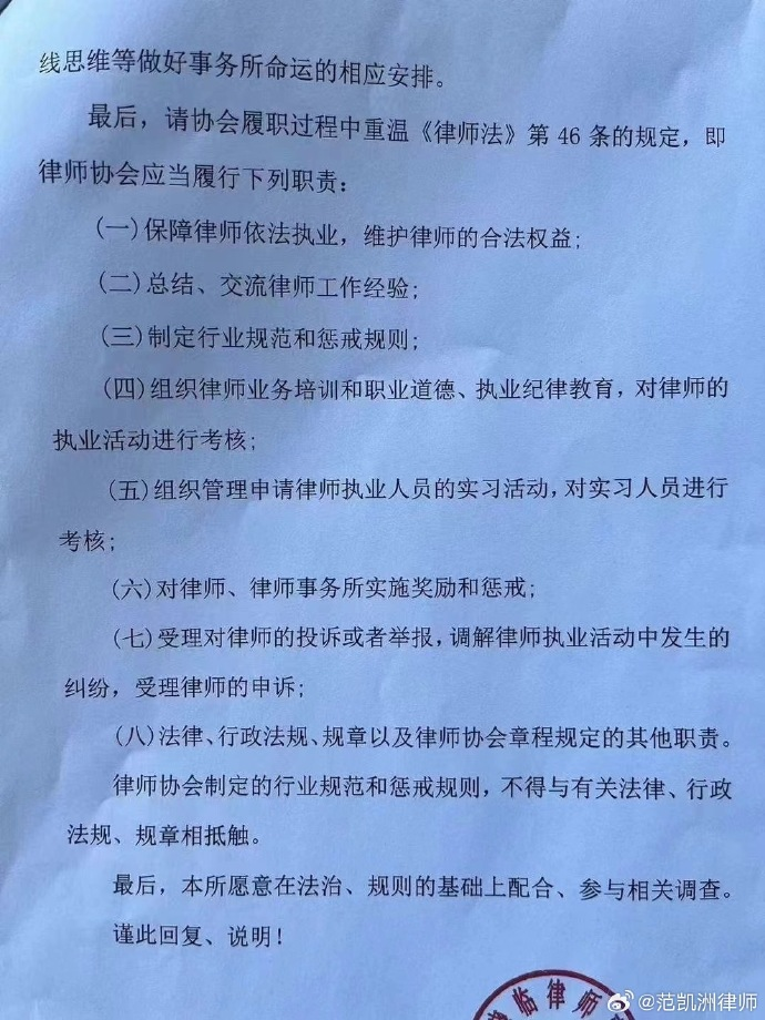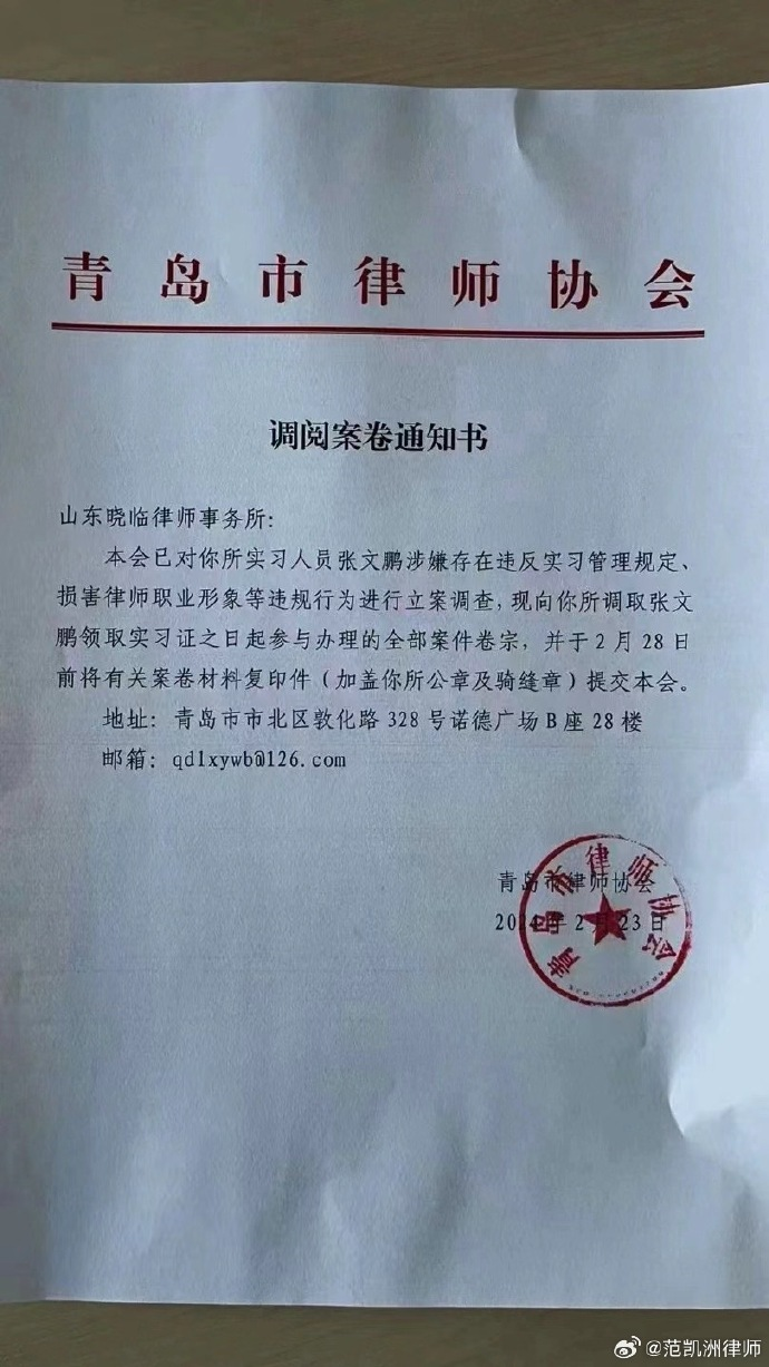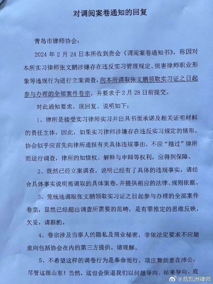 此前,法务之家推送过青岛律协对‘实习律师’张文鹏的立案通知。3月1日,微博@独立法律人张文鹏 贴出了青岛律协对实习律师张文鹏的<调阅案卷通知>书以及所在律所回复。详情如下: 调阅案卷通知书 山东晓临律师事务所: 本会已对你所实习人员张文鹏涉嫌存在违反实习管理规定:损害律师职业形象等违规行为进行立案调查,现向你所调取张文鹏领取实习证之日起参与办理的全部案件卷宗,并于2月28日前将有关案卷材料复印件(加盖你所公章及骑缝章)提交本会地址:青岛市市北区敦化路328号诺德广场B座28楼 邮箱:qdlxywb@126.com 2024年2月23日 对调阅案卷通知的回复 青岛市律师协会: 2024年2月24日本所收到贵会《调阅案卷通知书》,称因对本所实习律师张文鹏涉嫌存在违反实习管理规定、损害律师职业形象等违规行为进行立案调查,向本所调取张文鹏领取实习证之日起参与办理的全部案件卷宗,并要求于2月28日前提交。 对此通知要求,现回复、说明如下: 1、律所是接受实习律师实习并出具书面承诺及相关证明材料的责任主体,因此,如果实习律师涉嫌存在违反实习规定的情形,协会似乎应首先向律所通报有关具体违规事由,不应“越过”律所而迳行调查,律所的知情权、解释与申辩等权利,应得到保障。 2、既然已经立案调查,说明已经有了具体的违规事实,请结合具体事实说明需调取的具体案卷,并提供相应的法律、规则依据3、笼统地调取张文鹏领取实习证之日起参与办理的全部案件卷宗,显然已经超出调查所需要的范畴,是有罪推定的思维反映,欠妥,请斟酌。 4、卷宗涉及当事人的隐私及商业秘密,非依法定要求不应随意向包括协会在内的第三方提供。请理解。 5、不希望这样的调卷行为是奉命而行,项庄舞剑意在沛公,尽管这很山东!当然,这也会倒逼我们以问题导向、结果导向、底线思维等做好事务所命运的相应安排。 最后,请协会履职过程中重温《律师法》第 46 条的规定,即律师协会应当履行下列职责: (一)保障律师依法执业,维护律师的合法权益 (二)总结、交流律师工作经验: (三)制定行业规范和惩戒规则; (四)组织律师业务培训和职业道德、执业纪律教育,对律师的执业活动进行考核; (五)组织管理申请律师执业人员的实习活动,对实习人员进行 考核; (六)对律师、律师事务所实施奖励和惩戒; (七)受理对律师的投诉或者举报,调解律师执业活动中发生的纠纷,受理律师的申诉; (八)法律、行政法规、规章以及律师协会章程规定的其他职责。律师协会制定的行业规范和惩戒规则,不得与有关法律、行政法规、规章相抵触。 最后,本所愿意在法治、规则的基础上配合、参与相关调查。 谨此回复、说明! 微博知名法律博主@李庄 评价: 法律人与法律人的交流, 娘家人和女婿的对话, 既有意思,又令人深思, 无论怎样,专业人说话办事都要专业!
