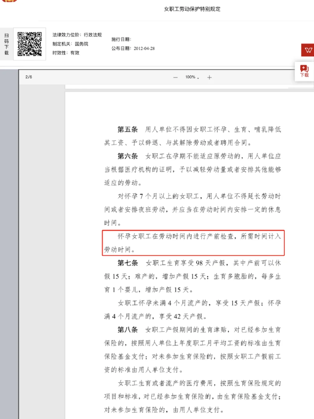 这次我直接就说,我看了有关妊娠的法规条例,里面确实没说有产检假,但是里面却规定了我产检期间是不能扣工资的,人事也直接认同了我的说法,没有任何反驳,后续的沟通也比我想象的愉快的多。她个人也去咨询了上海的社保局和卫健委,给我的最终答复是:16周后,我可以带薪产检次数应不低于9次!(这里我没有打电话确认)