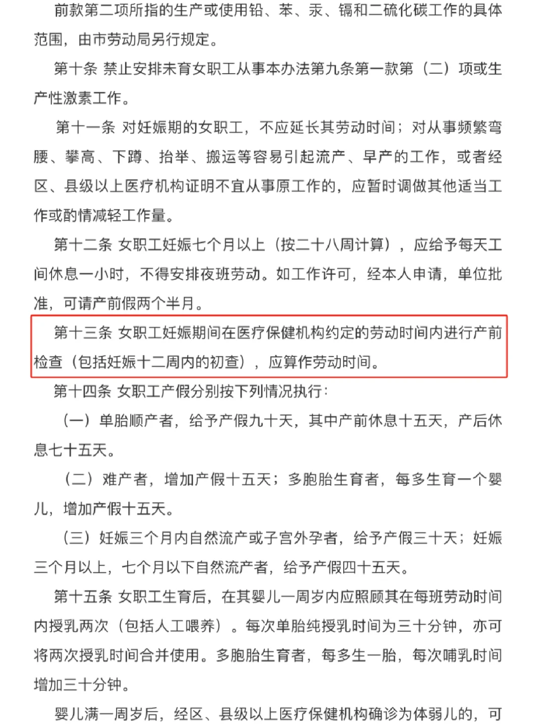 后来,找到了国务院出台的《女职工劳动保护特别规定》,第六条明确说明“怀孕女职工在劳动时间内进行产前检查,所需时间计入劳动时间”(图二所示),以及上海市出台的《上海市女职工劳动保护办法》,第十三条也明确指出了产检应计入劳动时间(图三所示),看到这里我有了底气,直接去找人事再次确认产检问题。
