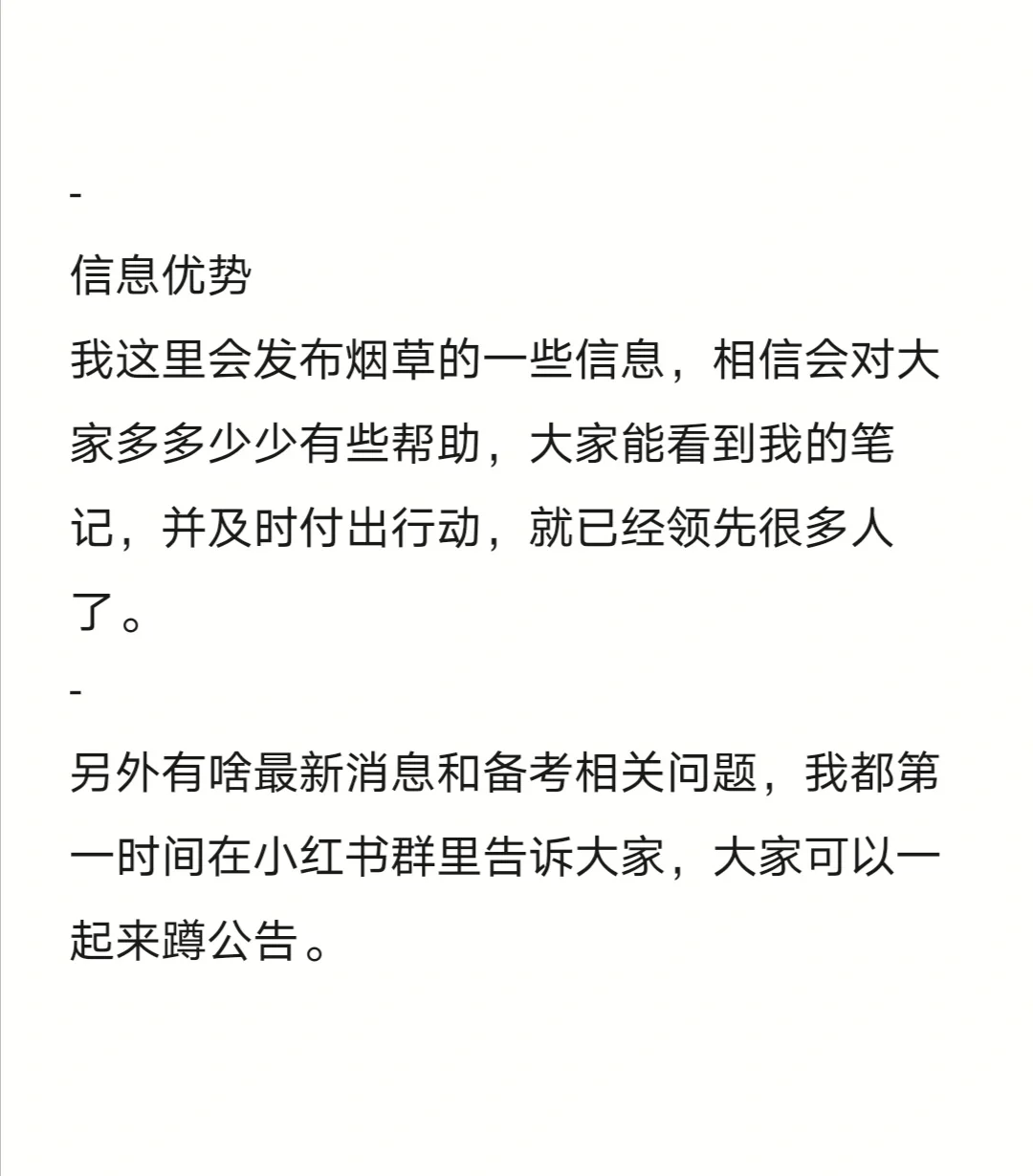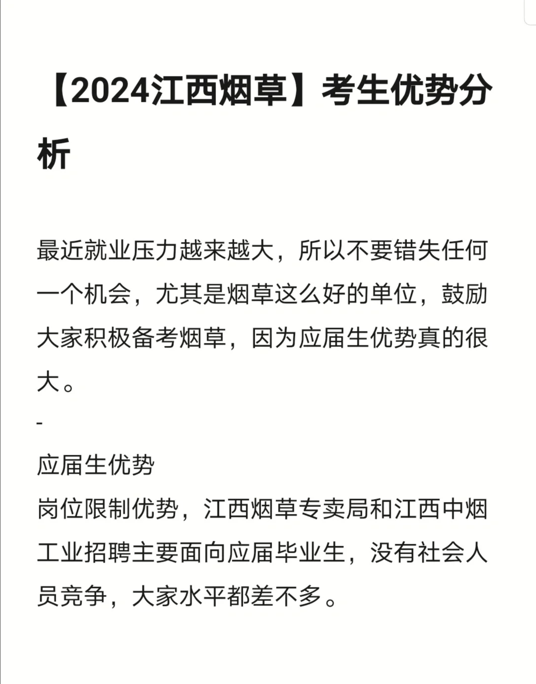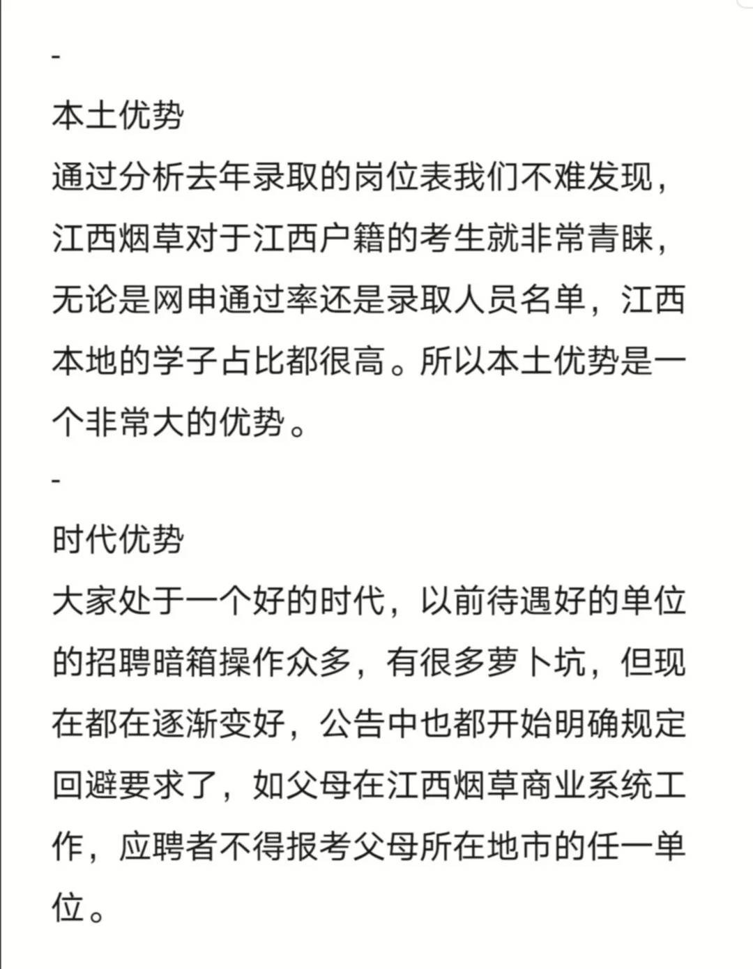 【2024江西烟草】考生优势分析 最近就业压力越来越大,所以不要错失任何一个机会,尤其是烟草这么好的单位,鼓励大家积极备考烟草,因为应届生优势真的很大。 - 应届生优势 岗位限制优势,江西烟草专卖局和江西中烟工业招聘主要面向应届毕业生,没有社会人员竞争,大家水平都差不多。 - 本土优势 通过分析去年录取的岗位表我们不难发现,江西烟草对于江西户籍的考生就非常青睐,无论是网申通过率还是录取人员名单,江西本地的学子占比都很高。所以本土优势是一个非常大的优势。 - 时代优势 大家处于一个好的时代,以前待遇好的单位的招聘暗箱操作众多,有很多萝卜坑,但现在都在逐渐变好,公告中也都开始明确规定回避要求了,如父母在江西烟草商业系统工作,应聘者不得报考父母所在地市的任一单位。 - 信息优势 我这里会发布烟草的一些信息,相信会对大家多多少少有些帮助,大家能看到我的笔记,并及时付出行动,就已经领先很多人了。 - 另外有啥最新消息和备考相关问题,我都第一时间在小红书群里告诉大家,大家可以一起来蹲公告。 #江西烟草笔试 #烟草 #烟草专卖局 #江西中烟 #中烟工业 #江西烟草专卖局 #江西省考 #江西考编 #江西招聘 #应届生 #2024年应届生 #应届毕业生找工作 #江西师范大学 #江西事业单位 #南昌大学 #江西财经大学 #南昌航空大学 |