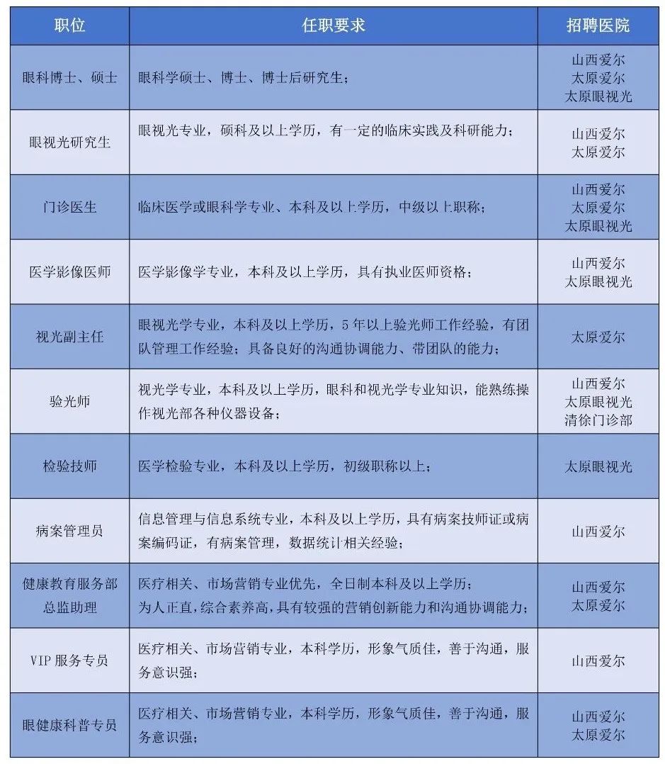 爱尔眼科医院太原区域现诚聘岗位如下: