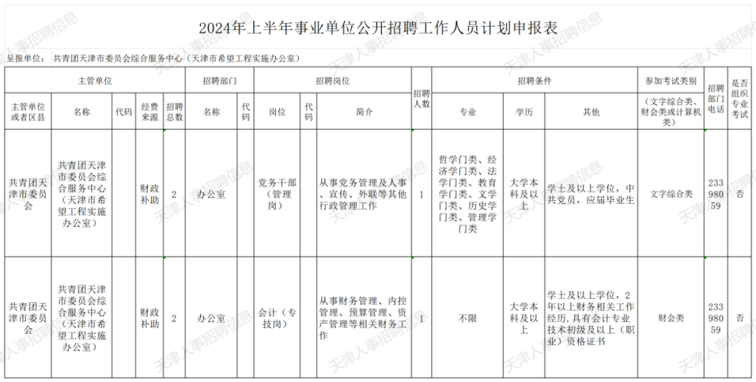 附件:共青团天津市委员会综合服务中心(天津市希望工程实施办公室)2024年上半年公开招聘工作人员计划表