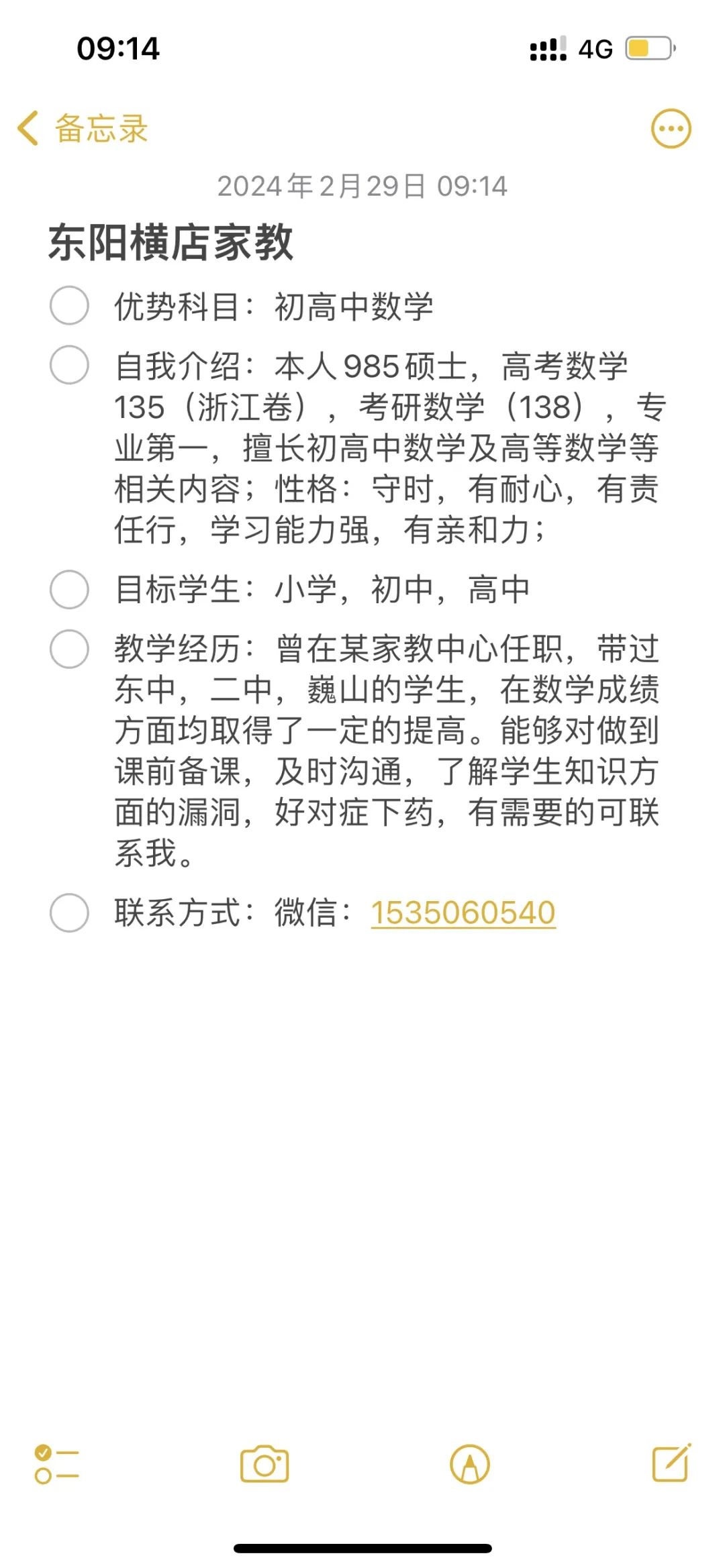 - [ ] 自我介绍:本人985硕士,高考数学135(浙江卷),考研数学(138),专业第一,擅长初高中数学及高等数学等相关内容;性格:守时,有耐心,有责任行,学习能力强,有亲和力;