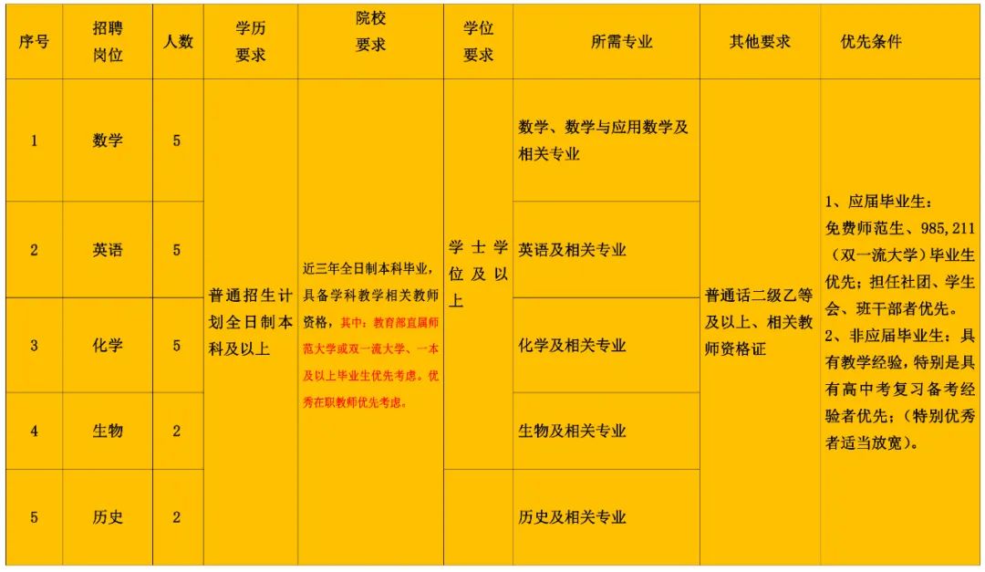 (5)具有教育教学经验,特别是具有高中考复习备考经验的名、特、优教师不受招聘岗位及人数的限制,可直接电话联系面谈。