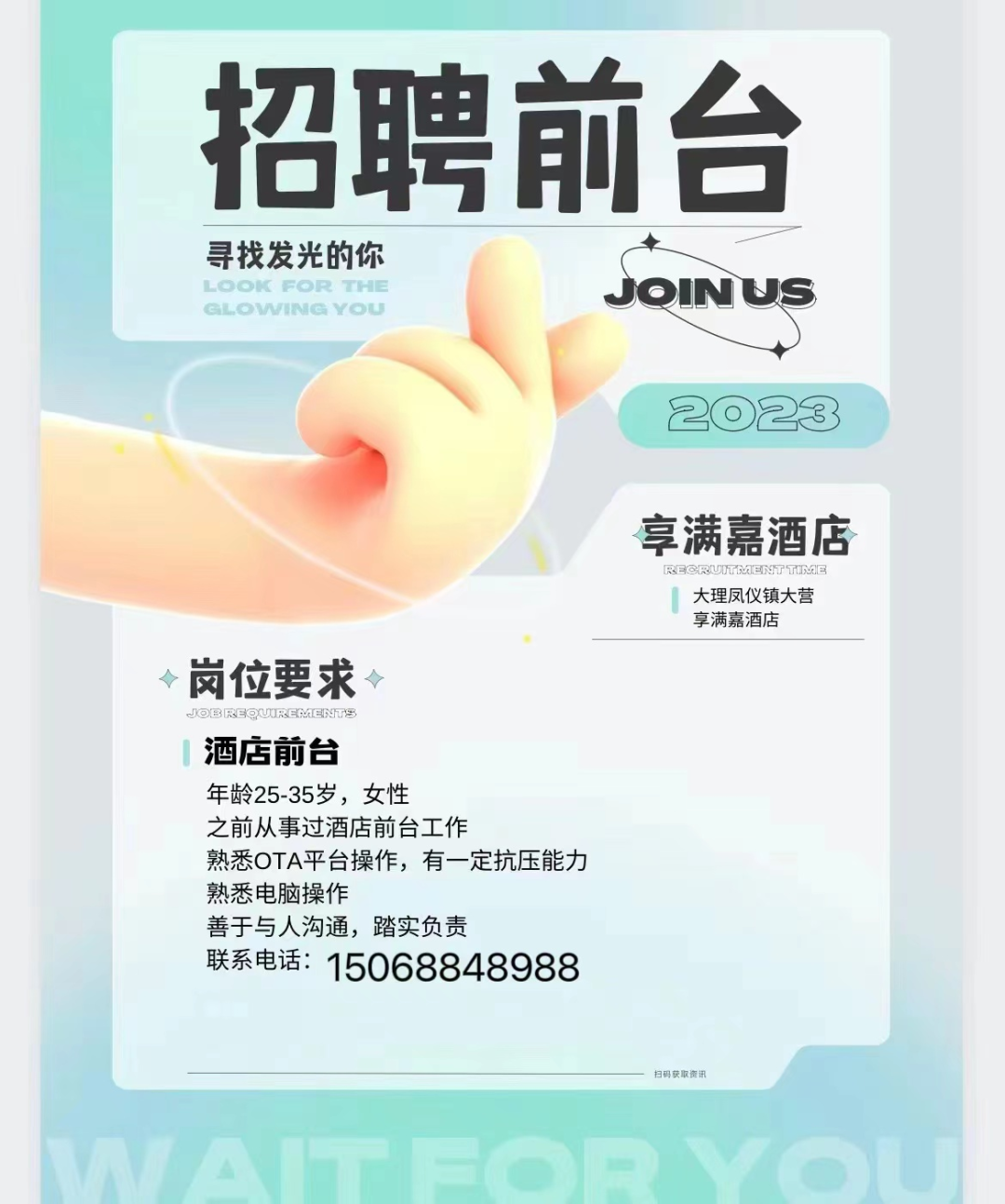 凤仪享满嘉酒店招聘酒店前台。