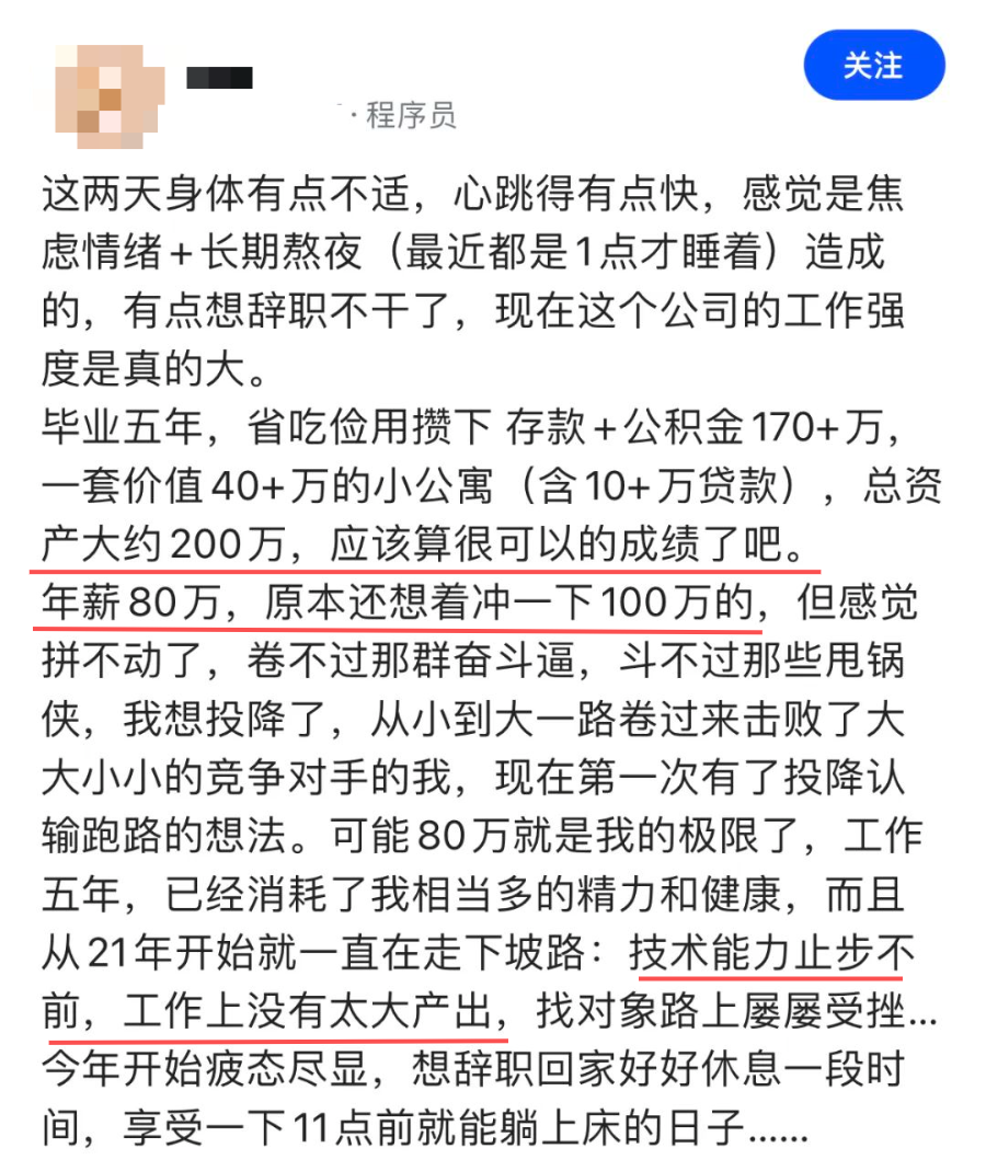 楼主是一个程序员,80万的年薪原本想冲100万,但是最近感觉公司的工作强度让他倍感焦虑,技术方面也遭遇瓶颈,想离职回家好好休息一段时间…