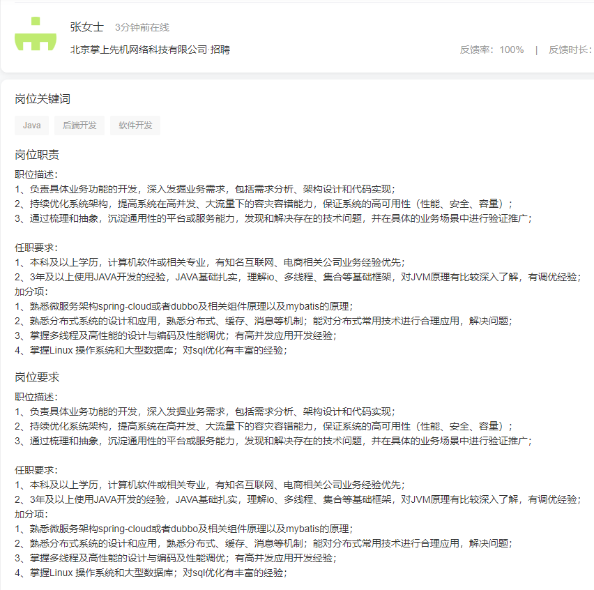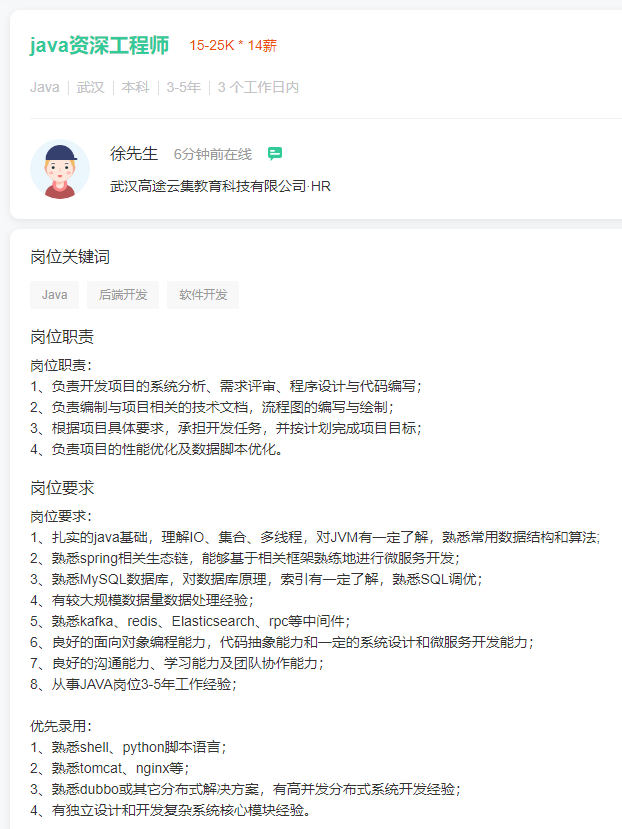 想要成为一名合格的中级Java工程师,你需要有扎实的Java基础,深入理解IO、集合、多线程,对JVM有一定了解,熟悉常用的数据结构和算法;熟悉Spring相关生态链,能够基于相关框架熟练进行微服务开发。高级Java工程师,一般是指5-10年工作经验的Java程序员。还是先来看看招聘网站上企业对高级Java工程师的岗位要求:从以上的岗位要求来看,可以看到几个关键词:分布式、微服务框架、Spring框架、主流开源框架,对这些都需要有丰富的经验,以及深入的理解。简单点来说,高级Java工程师更倾向于熟悉且深入理解各种框架,对技术和经验的要求更高了。