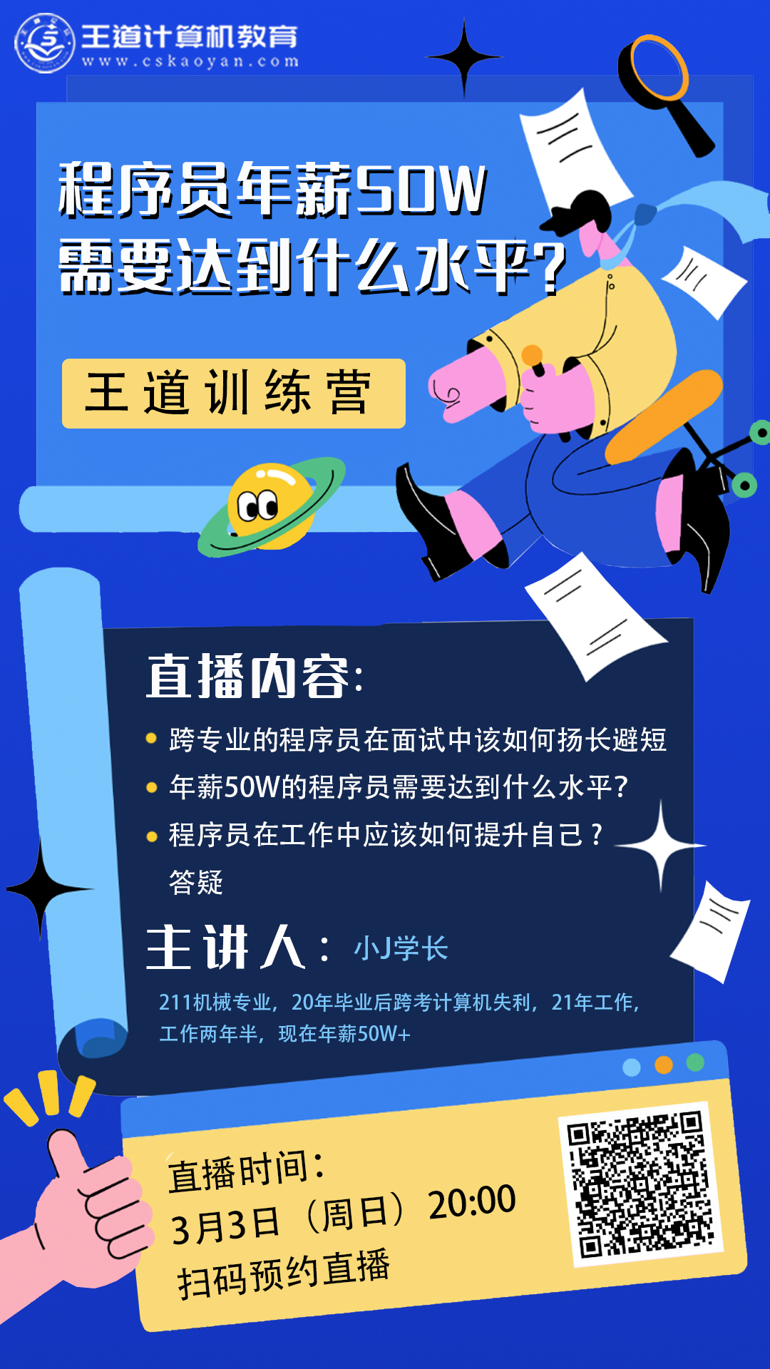 虽然上面提到技术和软实力都是程序员的护城河,但随着工作经验增长,后者的重要性会越来越大。单纯拥有拔尖的技术,可以把一个技术点做得很好;但还需要具备多方面的软实力,才能真正做成一件事。以上是小编从职业发展路线的方向分析的,如果想了解实际经验的话,建议大家来听学长的直播,小J学长从机械专业转行到Java,目前已经实现了年薪50W的小目标,作为一名Java程序员想要达到年薪50W,需要达到什么水平?这场直播将于3月3日(周日)晚8点,在B站“王道计算机教育”直播间开播,不想错过的同学记得扫码预约直播。