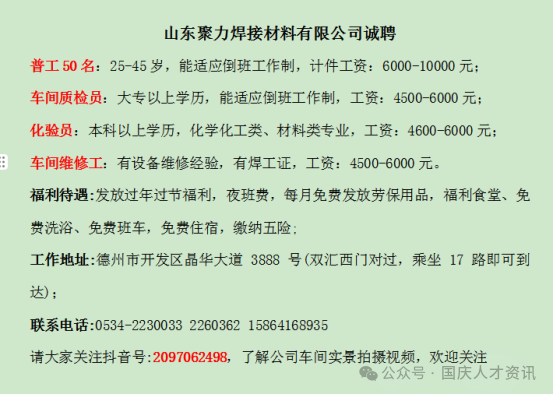 ②德州禹城电子厂大量招聘,年龄 男女16-45周岁 ,工资17/小时,工期一个月以上,12小时俩班倒 做六休一。6000元/月,提供吃住
