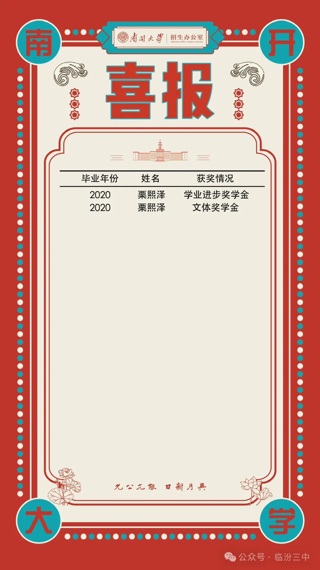 南开大学向我校发来喜报