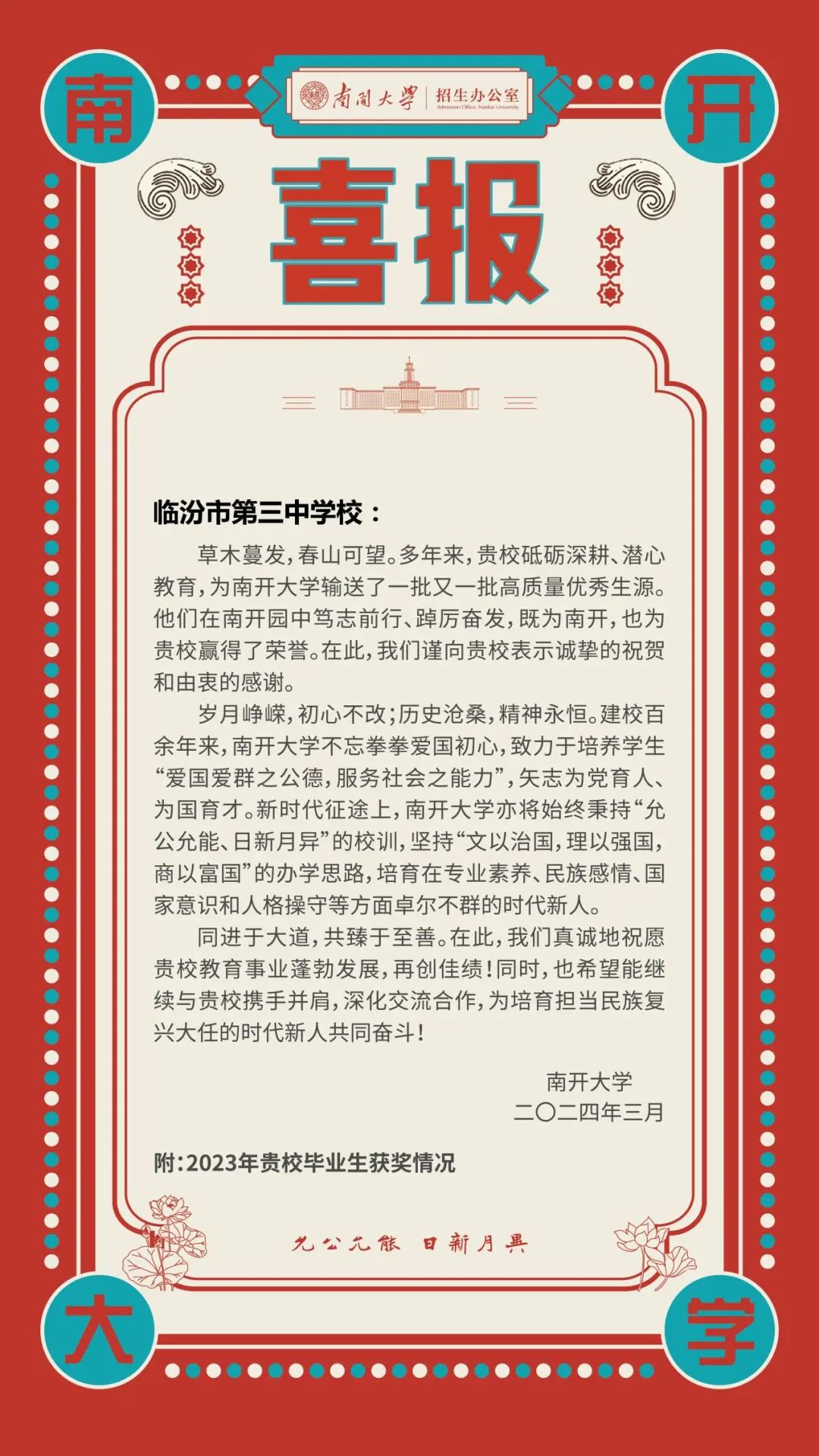 >南开大学向我校发来喜报
