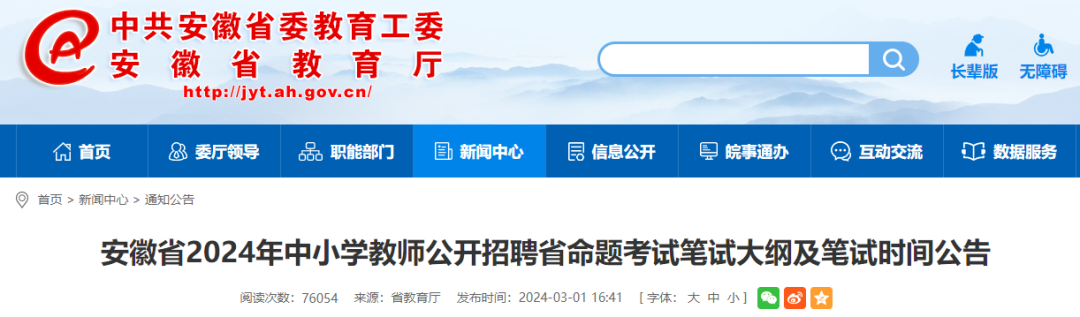 根据《安徽省教育厅 中共安徽省委机构编制委员会办公室 安徽省财政厅 安徽省人力资源和社会保障厅关于进一步完善中小学教师招聘制度落实市县中小学教师招聘主体责任的通知》(皖教秘师〔2020〕90号)关于“中小学教师招聘按照人事管理权限,由各市、县(市、区)依法依规自主组织实施”“省教育厅原则上于每年3月份最后一个周末提供一次命题试卷服务,各地可自愿选用”的规定,省教育厅制定了《安徽省2024年中小学教师公开招聘省命题考试笔试大纲》(见附件),供2024年报考使用省命题试卷的市县中小学教师招聘岗位的考生参考。......................................使用省命题试卷的市、县(市、区)统一笔试时间:2024年3月31日 9:00—11:30《学科专业知识》(满分120分);14:00—16:00 《教育综合知识》(满分120分)。自主命题的市、县(市、区)考试时间由各地自行确定。公告、报名、考试、阅卷、划定分数线等考务工作均由各地按照相关规定自主组织实施。请广大考生及时关注各地教育行政部门及各县(市、区)人民政府官方网站等发布的相关信息。附件:安徽省2024年中小学教师公开招聘省命题考试笔试大纲..........................................
