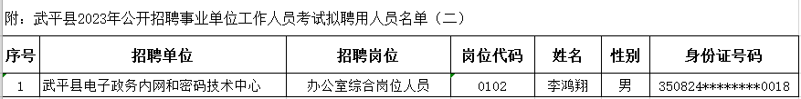 武平县2023年公开招聘事业单位工作人员考试拟聘用人员公示(二)