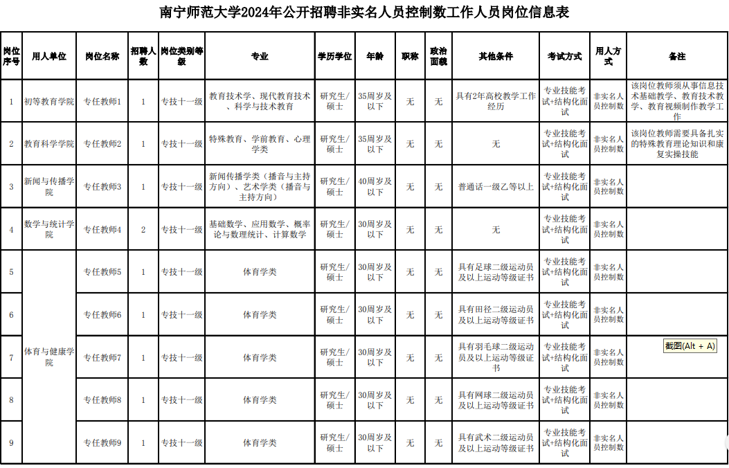 5.每个岗位按照不少于1:3比例组织测试,确因特殊情况达不到开考比例的岗位,经学校核准后,按实际符合报考条件人数调整开考比列,并在我校官网(http://www.nnnu.edu.cn)发布调整公告。