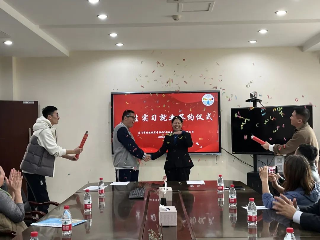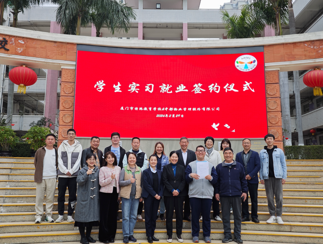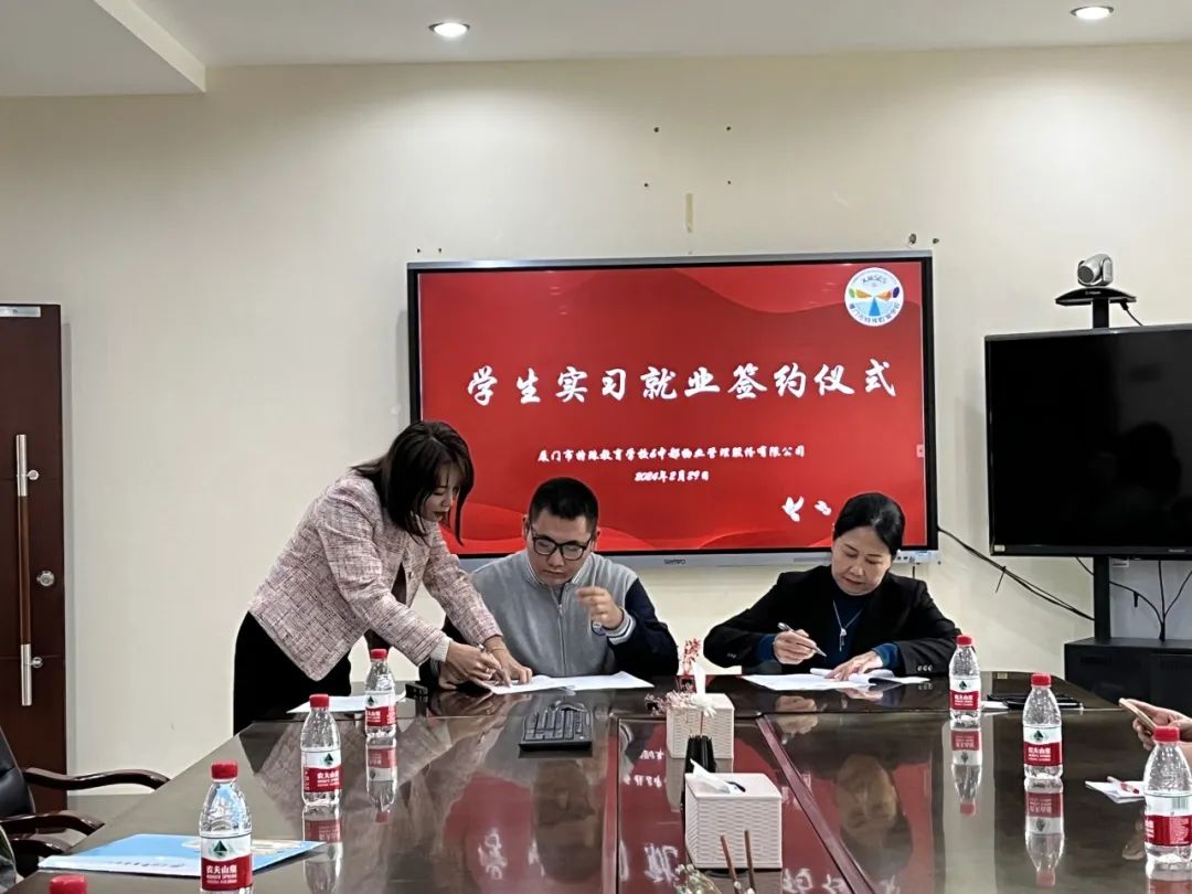 林同学作为一名台胞学生,在我校就读已是第三年,在校期间尊重师长、团结同学,正是其优异表现为他争得了这次就业机会。在我校与中都物业以往合作的基础上,我校就业支持团队历时一学期,经过家校企三方会谈、面试等一系列准备工作,中都物业正式录用我校林同学。因此,2月29日,我校举行签约仪式,由林同学与中都物业正式签订协议。受邀出席本次签约仪式的嘉宾有:原厦门市副市长、厦门市教育基金会理事长潘世建,我校书记校长陈莎茵、副书记段新安,企业代表中都物业董事长蓝四英、物业主任康煌莺,我校办公室副主任阮班松、职高部部长施静、就业支持团队负责人赵广赢及其团队,林同学及家长。