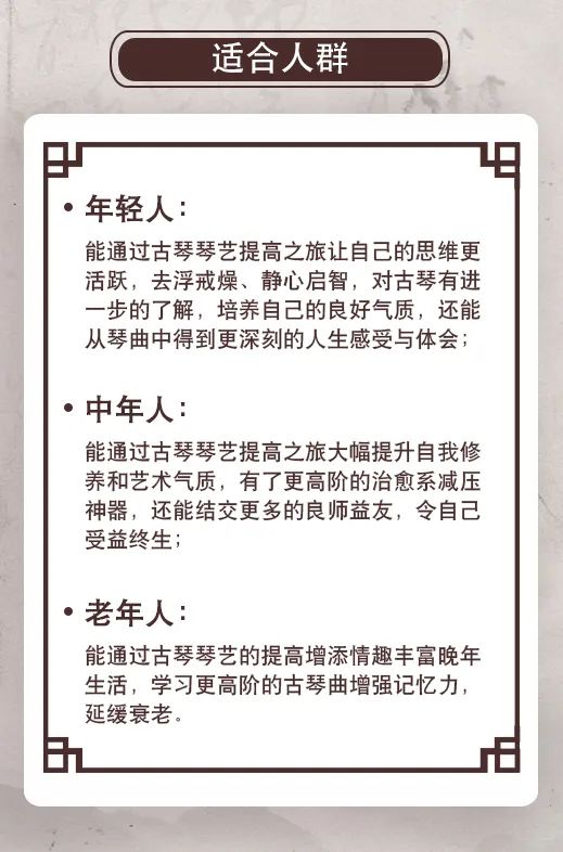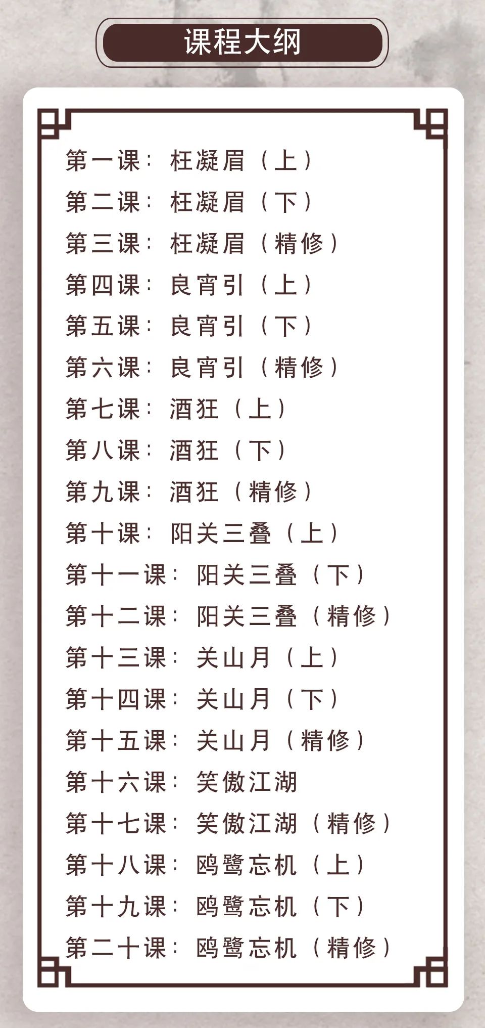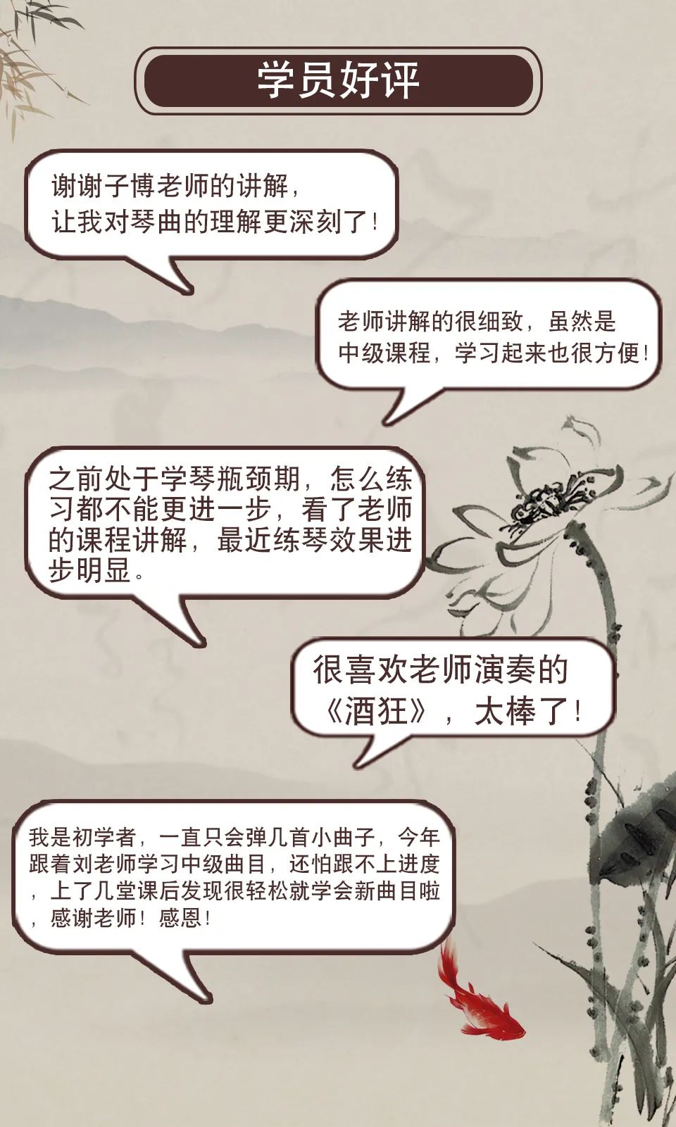 古琴是最具民族文化属性的乐器,自古以来,琴、棋、书、画便是文人墨客用以修身养性、陶冶情操、增长智慧、锻炼意志,从而达到天人合一的方法和途径。这四艺之中,又以排在首位的古琴历史最为悠久。古琴能传承这么久,可以看出古琴其独特的魅力,但是想学好古琴有点难。有些琴友由于老师水平有限导致长时间琴技没有提高;有些琴友学了很久却毫无长进,好像是陷入瓶颈期;有些琴友是一直在小曲子里徘徊,想找一些机会学习一些更高阶新曲子。我们邀请了青年琴家刘子博老师开设这门古琴中级课程,跟着老师,学习琴曲的正确指法,以及琴曲的情绪处理。课程内容轻松有趣,简单易懂!让你轻松学习中级古琴曲目!