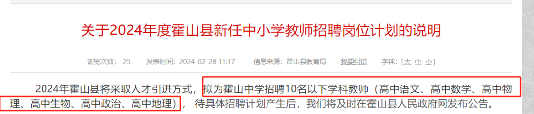 关于2024年度霍山县新任中小学教师招聘岗位计划的说明
