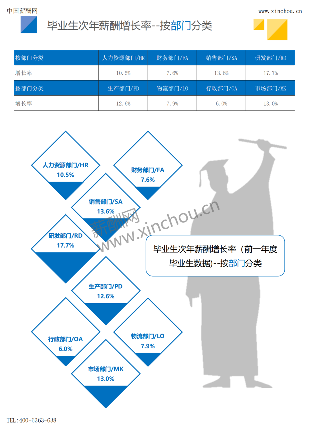 总体来看,毕业生次年薪酬增长率:研发>销售>市场>生产>人力资源>物流>财务>行政。