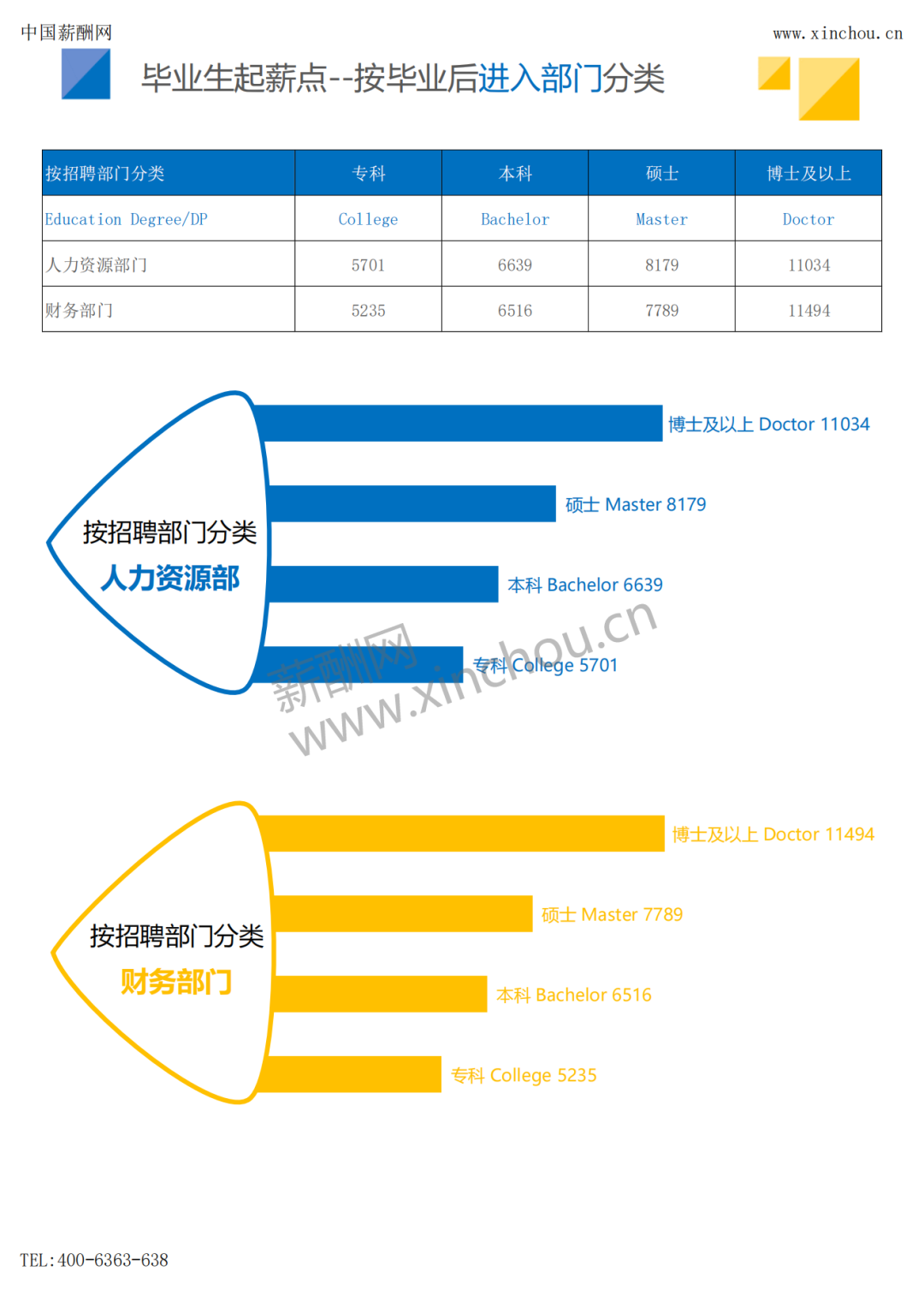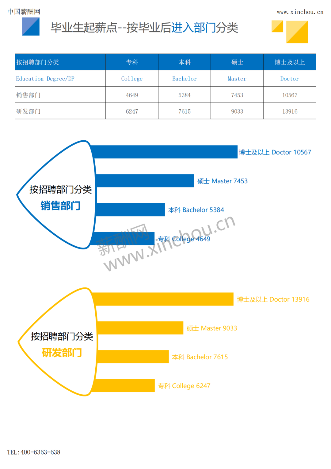 其中,入职人力资源部门的毕业生起薪点总体上稍高于财务部的毕业生。而入职研发部门的毕业生起薪点高于销售部门1500-3000元。