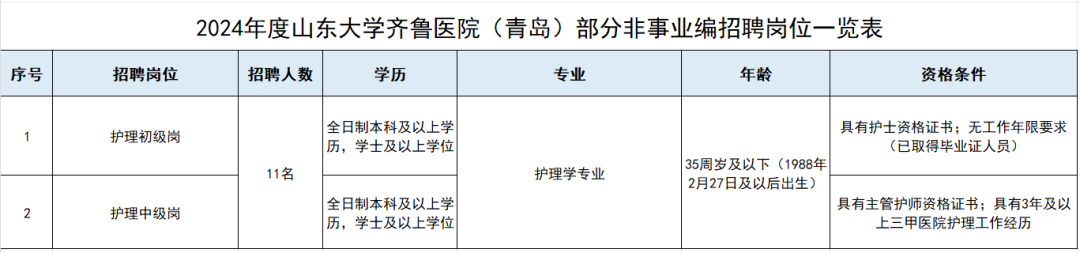 具体详见附件1:山东大学齐鲁医院(青岛)2024年度部分非事业编制岗位招聘一览表。
