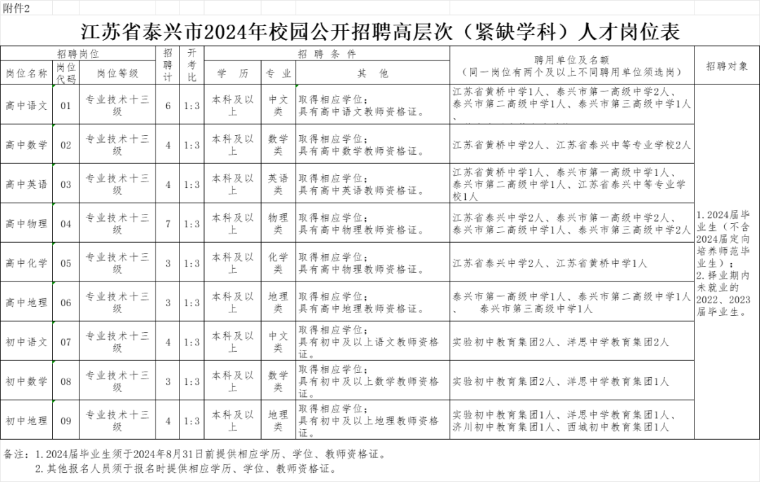 9.具备招聘岗位所要求的其他资格条件,具体招聘岗位、计划及相关要求等详见《江苏省泰兴市2024年校园公开招聘高层次(紧缺学科)人才岗位表》(附件2)。