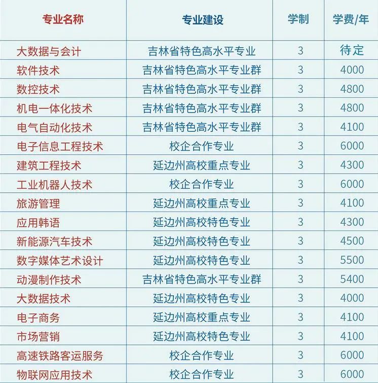 学院承接国家《职业教育提质培优行动计划(2020-2023年)》32项,着力对接延边州产业发展,计算机软件技术、智能制造与控制技术、大数据与会计等3个吉林省特色高水平高职专业(群)对接相关行业需求,从“对接行业”向“服务行业”发展。大数据与会计专业通过省级现代学徒制试点项目验收。建设244门高职课程教学资源、12276个多媒体教学资源、5门在线开放课程。先后获得国家级高职院校职业技能大赛三等奖2次,省级高职院校职业技能大赛一等奖12次、二等奖29次、三等奖48次,国家相关行业协会职业技能比赛一等奖3次,三等奖3次,省级相关行业协会职业技能比赛特等奖3次、一等奖2次、二等奖7次,三等奖7次。