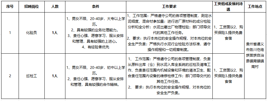 招聘要求:认同蒙西文化;年龄35岁以下;可接收应届毕业生;了解水泥生产工艺。招聘专业:大专以上学历,机械自动化、机电一体化、水泥工艺、无机非金属、材料学、化学分析、化学工艺等专业。