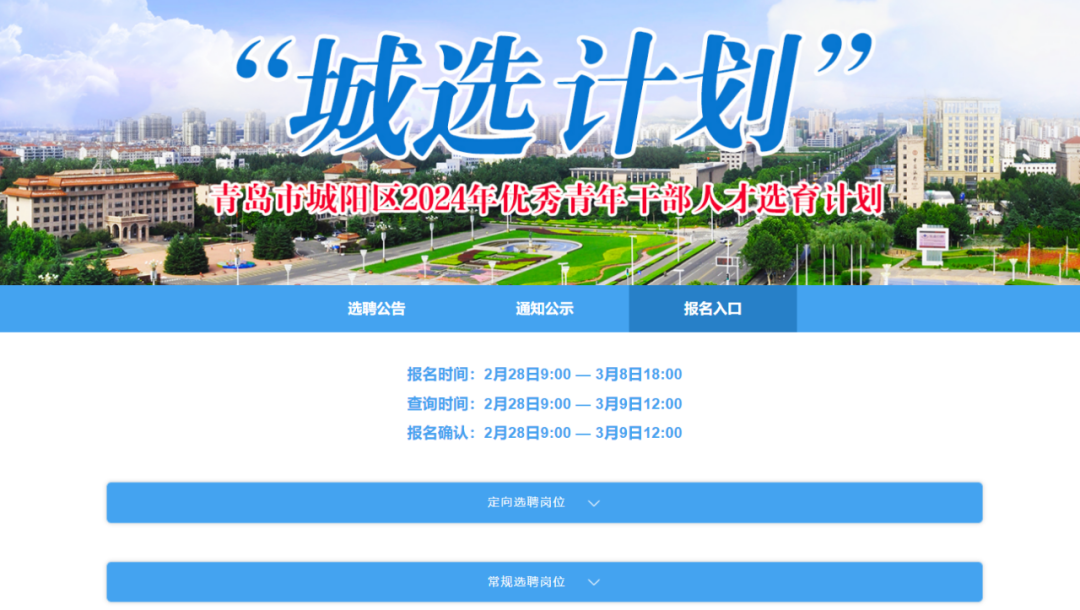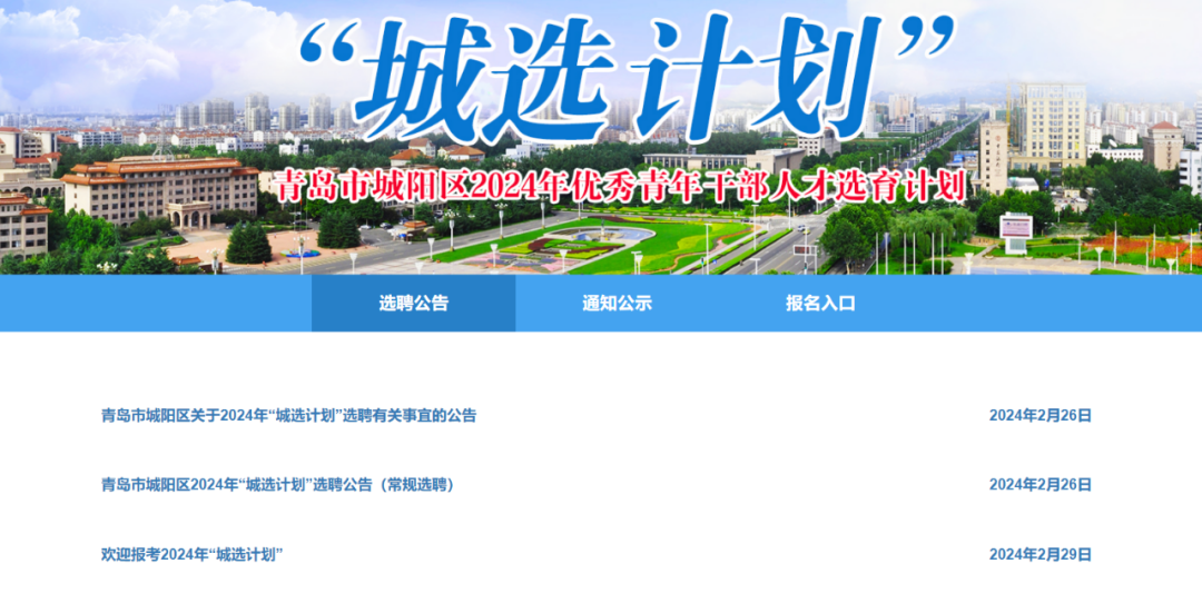 青岛市城阳区“城选计划”常规选聘面向国内外部分高校、部分驻青高校和重点合作高校(见附件1)组织实施,共计划选聘人数89名左右,具体数量根据选聘工作情况确定。常规选聘共分2类岗位,分别为“综合管理岗位A”和“综合管理岗位B”,其中“综合管理岗位B”计划选聘人数15名(街道事业编制岗位)。坚持品学兼优,突出政治标准,报考人员须符合以下基本条件:1.具有中华人民共和国国籍,且无国(境)外永久居留权。2.有正确的政治立场和政治态度,遵守中华人民共和国宪法和法律,拥护中国共产党领导和社会主义制度,自觉践行社会主义核心价值观,爱党爱国,有理想抱负和家国情怀;道德品行好,遵纪守法,作风踏实,组织纪律观念强。3.在校期间综合表现优良,具备良好的道德品行,有较好的人际沟通和语言表达能力,有服务基层的意愿和吃苦耐劳的精神,身心健康,符合录用体检标准。4.2024年全日制应届大学本科及以上学历毕业生,理学、工学、经济学、农学、管理学、法学、文学、教育学、历史学、哲学、医学、艺术学学科门类。本科生、研究生毕业证书和学位证书应按规定学制如期取得(博士研究生应在录用报到前取得)。5.截至2024年6月30日前,年满18周岁(2006年6月30日前出生)。其中,大学本科毕业生25周岁以下(1998年7月1日及以后出生),硕士研究生30周岁以下(1993年7月1日及以后出生),博士研究生35周岁以下(1988年7月1日及以后出生)。大学学制为5年及以上的,以学制4年为基数,学制每增加1年相应放宽1岁。独立学院毕业生,委托培养、在职培养和定向培养的毕业生,不在选聘范围。有关国内高校、有关国(境)外高校可报考“综合管理岗位A”或“综合管理岗位B”。有关驻青高校及重点合作高校仅限报考“综合管理岗位B”,并需满足以下条件之一:①中共党员(含预备党员)或已列为党员发展对象且在2024年3月底前能被发展为预备党员的;②在大学或研究生就读期间,担任过班长、副班长,党(团)支部书记、副书记,校、院级学生会主席、副主席、部长等主要学生干部连续半年以上(截至2024年2月29日);③大学或研究生就读期间,获得过校级及以上优秀学生干部、三好学生、优秀毕业生等荣誉称号。本次选聘按网上报名、资格审核、初选、综合测试、考察体检、公示聘用的程序进行。1.提交报名信息(2月28日9:00—3月8日18:00)。符合条件且有报考意愿的学生,登录青岛城阳政务网(http://www.chengyang.gov.cn/,以下简称“报名网站”)“城选计划”专栏,点击“报名入口”,进入系统进行报名,每人限报一个岗位。网上报名信息经本人确认无误后,点击“信息确认”,系统生成并提示下载《青岛市城阳区2024年“城选计划”报名信息登记表》(以下简称《信息登记表》)。报名人员必须使用有效居民身份证进行报考,姓名、身份证号码等个人信息必须真实一致。本次报名免收报名费和考务费。2.上传审核资料(2月28日9:00—3月8日18:00)。报考人员在信息确认后,下载打印《信息登记表》,交所在院系党组织等审核盖章后,制作成清晰的电子图片(扫描或拍摄成JPG、PNG、GIF、JPEG格式,大小在3M以内),通过报名系统上传。上传成功后,进入报名资格待审核状态。在资格审核前多次提交报考信息的,后一次填报自动替换前一次填报的信息。3.查询资格审核结果(2月28日9:00—3月9日12:00)。资格审核一般需1-2个工作日,报考人员须于规定时间内,及时登录报名网站查看资格审核结果。报名信息一经审核通过,不能更改。报名信息尚未审核或未通过审核的,在3月8日下午18:00前可以更改,逾期不能更改。4.报名确认(2月28日9:00—3月9日12:00)。资格审核通过后,报考人员须于规定时间内进行报名确认。报名确认后,方为报名成功;未按期进行确认的,视为放弃报名。网上报名期间,将在报名网站及时更新选聘岗位的报名信息,符合条件的考生要及时关注了解,结合个人情况和报名人员数量作综合分析,防止过于集中在部分岗位。资格审核贯穿于选聘工作的全过程。任何环节发现考生有不符合选聘资格条件或存在弄虚作假情形的,一经查实,取消选聘资格。报名确认后,将组织安排初选,具体时间、地点等事宜另行通知。通过初选的人员进入综合测试环节。综合测试采用“结构化面试”方式,具体时间、地点另行通知。届时须携带本人身份证、《信息登记表》原件和诚信承诺书等前往。综合测试客观全面了解人选的政治品质、思想道德、基本能力和发展潜力,成绩采取百分制计分、加权计算的方式,精确到小数点后两位数,尾数四舍五入。综合测试成绩即为总成绩(若总成绩相同,则依次比较考生的学历层次高低、入党时间早晚、担任主要学生干部情况等因素确定考生排名顺序)。综合测试设置合格分数线,未达到合格分数线的,不列入考察和体检范围。根据总成绩,分选聘岗位按1:1的比例确定考察体检人选名单。考察工作参照公务员录用考察有关规定组织开展。报考人员在选聘期间的表现,作为选聘考察的重要内容之一。考察不合格或者放弃考察资格的,取消选聘资格。体检工作参照公务员录用体检标准和要求执行。放弃体检或体检不合格的,取消选聘资格。考察、体检具体时间和地点另行通知。对考察体检过程中弄虚作假、隐瞒实情等造成结果失真的,取消选聘资格。1.根据综合测试、考察、体检等情况,确定拟聘用人