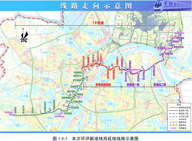 2月28日,武汉地铁集团官网公布了新港线西延线的环境影响评价报告,其中详细展示了10号线(新港线)的全部走向图。