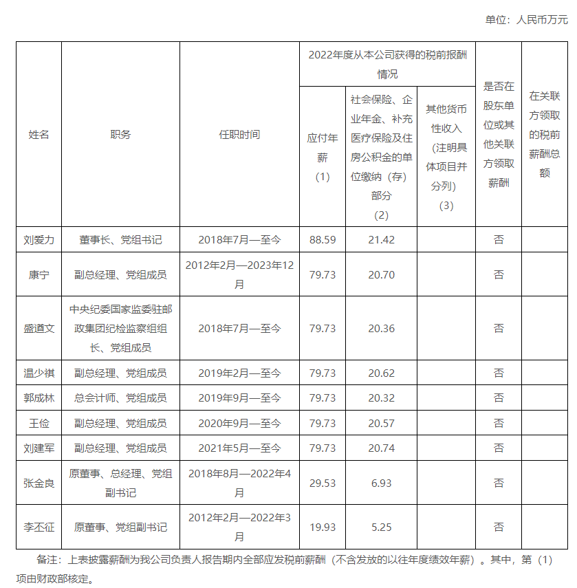 邮政集团董事长、党组书记 应付年薪为88.59万元,
