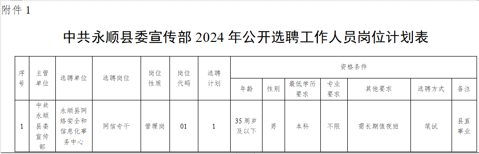 本次公开选聘岗位计划1名,具体条件见《中共永顺县委宣传部2024年公开选聘工作人员岗位计划表》(附件1)。