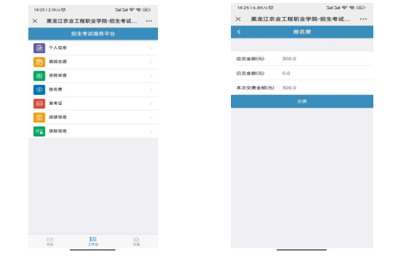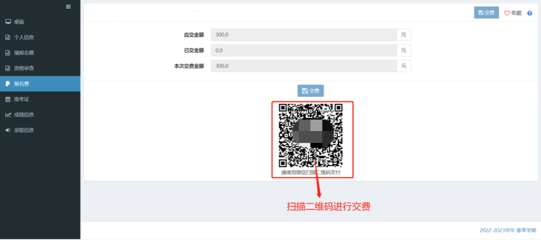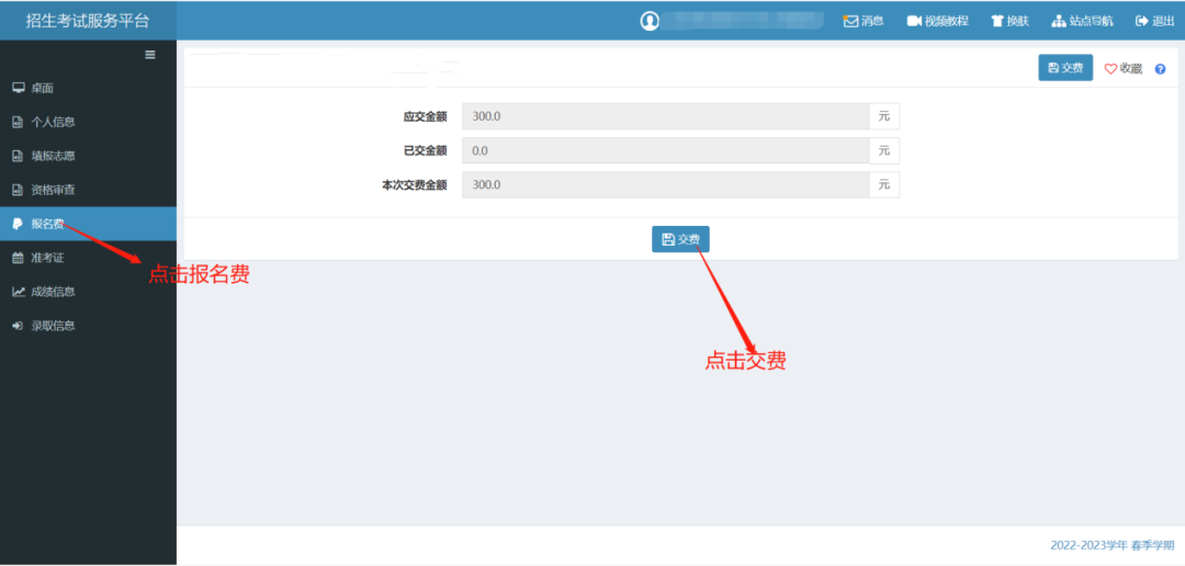 3、登录之后,点击左侧菜单的“报名费”,显示应交金额300.0,然后点击下面的“交费”按钮。