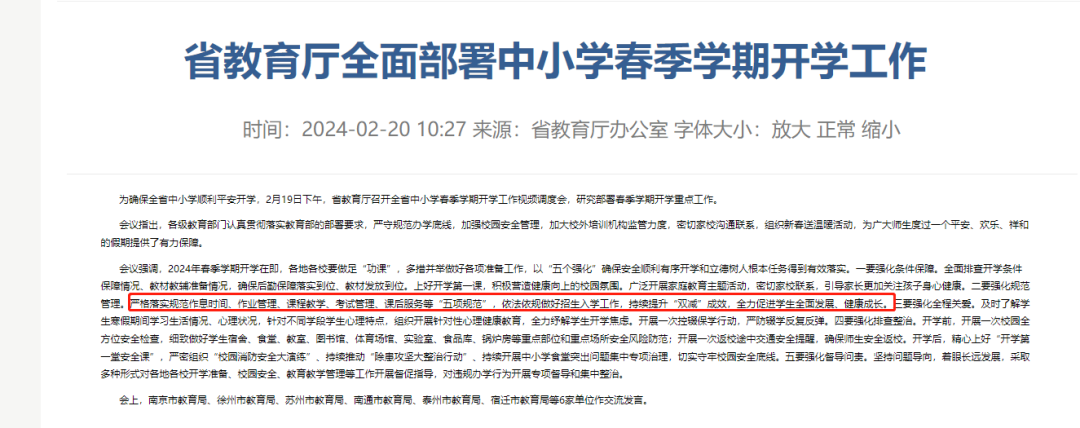 2月19日,江苏省教育厅召开全省中小学春季学期开学工作视频调度会,明确提出要认真贯彻落实教育部部署要求,严格落实规范作息时间、作业管理、课程教学、考试管理、课后服务等“五项规范”。图源:江苏省人民政府