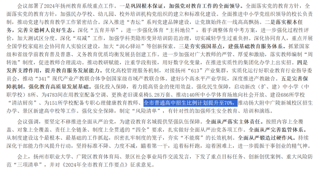 昨日扬州教育局发布:今年全市普通高中招生比例计划提升至70%。