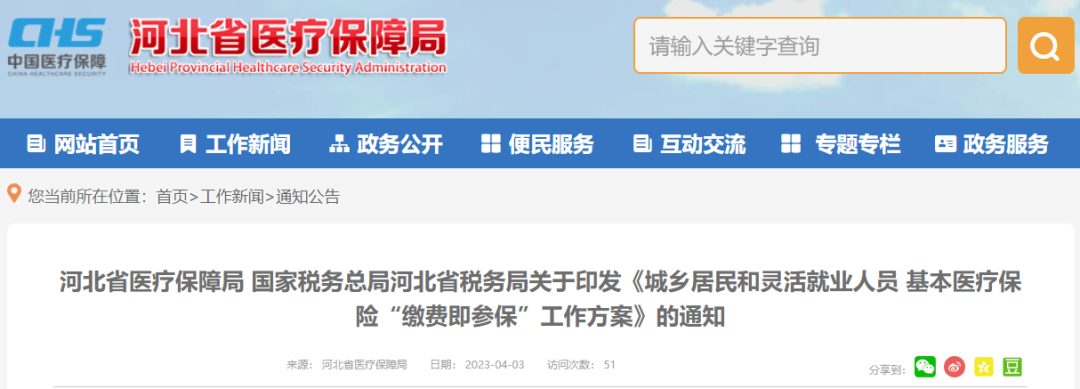 深入贯彻落实党的二十大精神,以人民为中心,为缴费人提供更便捷的参保缴费服务,在现行医保部门负责参保登记、税务部门负责申报缴费的职责分工基础上,增加“缴费即参保”便民服务措施。城乡居民和灵活就业人员通过“河北税务”微信公众号线上申报缴费时,可由税务部门代为采集参保信息,线上推送至医保部门,由医保部门完成参保登记。通过数据多跑路,让缴费人少跑腿,实现参保缴费“一件事一次办”,提升医疗保险参保缴费服务水平。