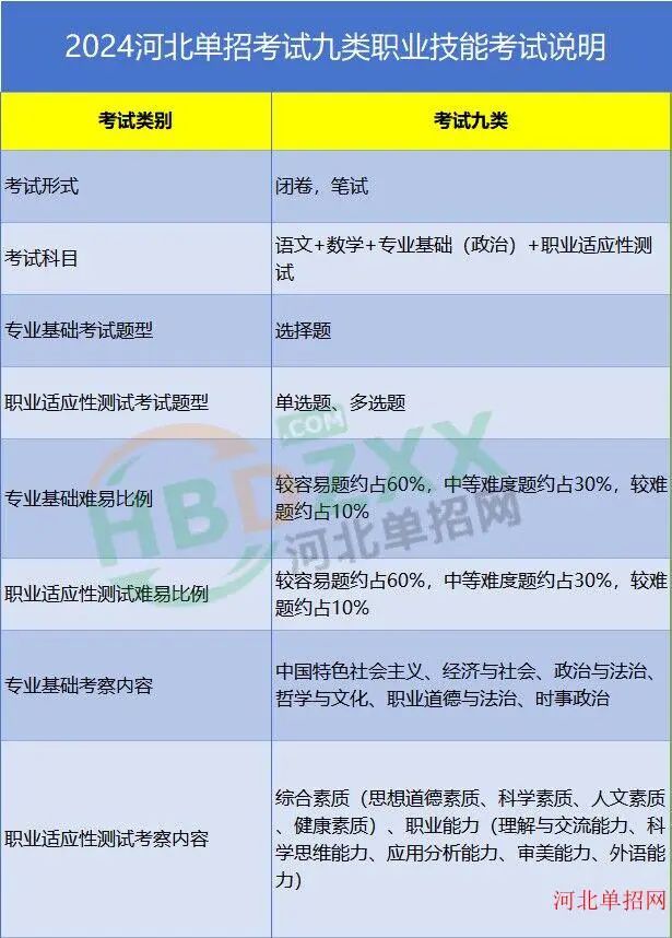 考试九类:2024河北省高职单招考试九类专业基础政治考试说明、2024年河北省高职单招考试九类职业适应性考试说明