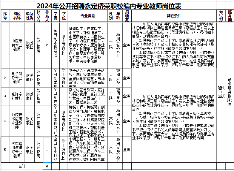 计划招聘6名专业教师,其中:中医康复2名,电子商务、烹饪、数控技术应用、汽车运用与维修各1名。具体招聘岗位、人数及资格条件等详见《2024年公开招聘永定侨荣职校编内专业教师岗位表》(附件1)。以上招聘岗位若出现空缺,则用于永定区2024年中小学幼儿园新任教师公开招聘。