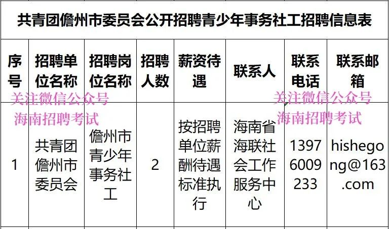 详见附件1《共青团儋州市委员会公开招聘青少年事务社工招聘信息表》。