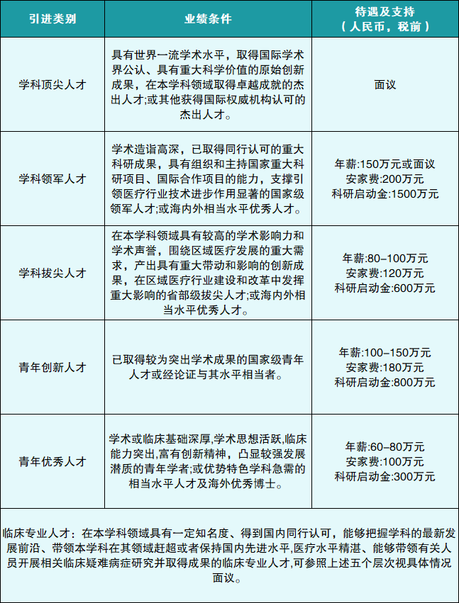 备注:具体待遇以医院最新的文件及协议约定为准。在院工作期间,科研成果按医院科研奖励办法给予奖励; 所有人才来院工作后将享受医疗保健、配偶根据条件优先安置、安排子女入学等福利待遇; 优先支持申报各类人才项目; 在资源配置、团队和平台建设、国际合作与交流、研究生招生等方面提供优先支持; 全职引进,5 年聘任期满, 合同执行良好者可转为长期聘用。